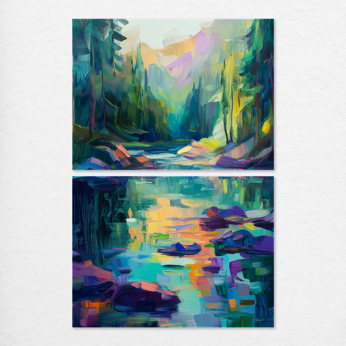 Hand-painted wall art brings to life a calm river meandering through vibrant woodlands, with reflections dancing on the water's surface in a gentle symphony of color.