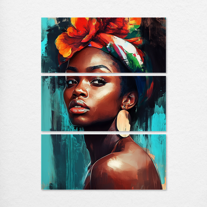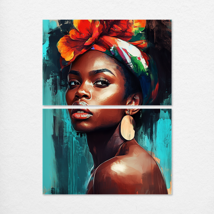 A bold and emotive hand-painted portrait that merges rich textures and vibrant colors to depict a woman with striking presence. The teal and red hues create a dynamic balance of intensity and calm, inviting viewers to connect with her story.