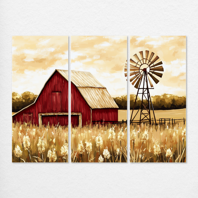 A classic red barn and windmill ascend from golden fields, instantly evoking the tranquil charm of rural life. The composition utilizes warm, earthy tones and rich texture, capturing the nostalgic spirit of open landscapes and simpler times. This visual statement is an ideal decorative piece for a living room, bedroom, or kitchen.