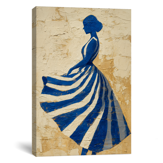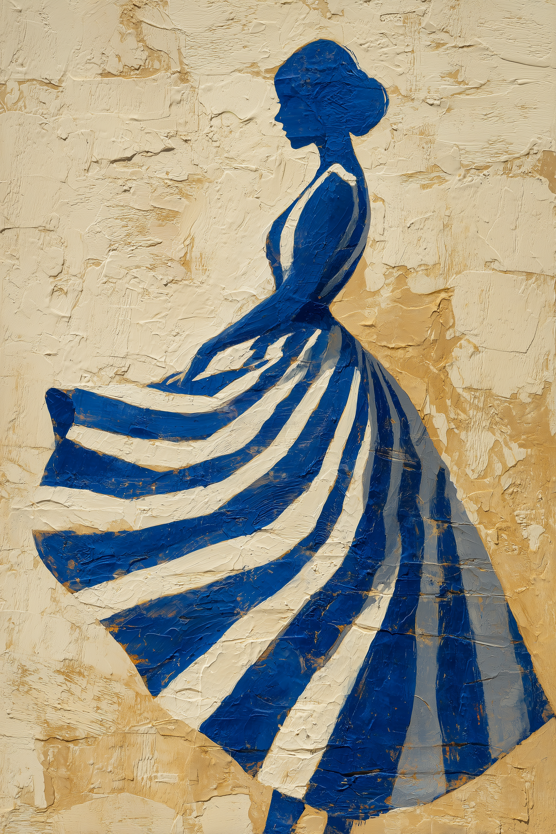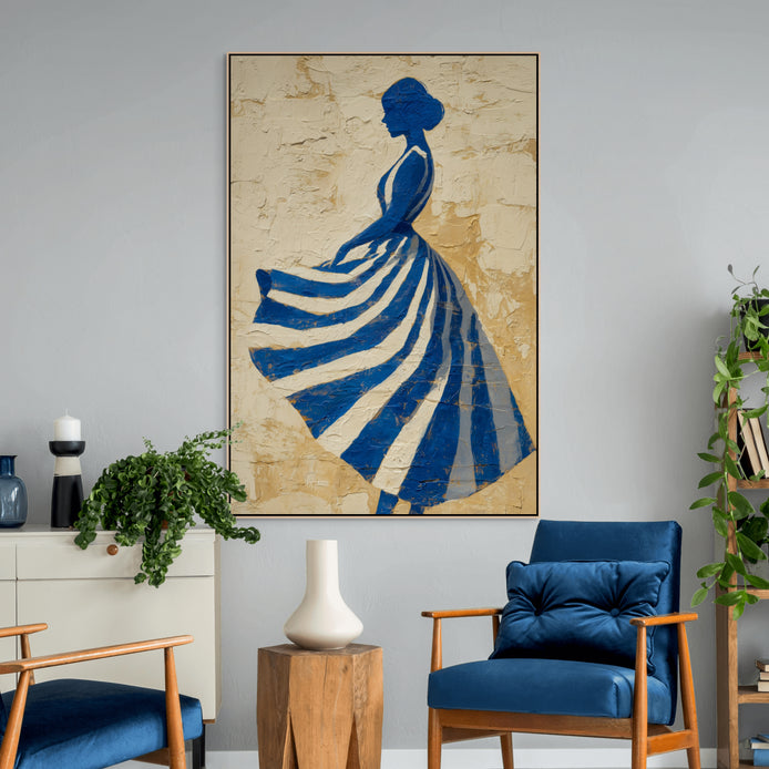 This hand-painted wall art showcases a graceful silhouette of a woman in a striped dress. The blue and gold colors create a striking contrast, emphasizing the beauty and elegance of movement.