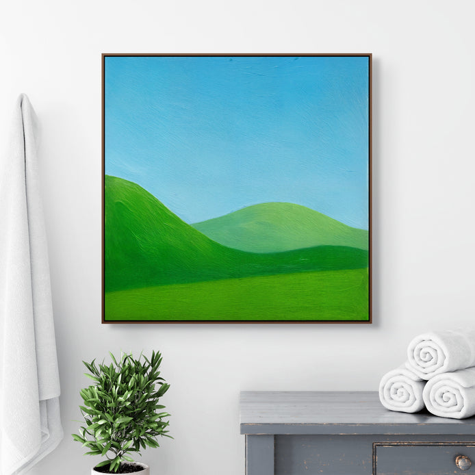 This hand-painted wall art features lush green hills gracefully rolling under a vibrant blue sky, embodying the beauty of nature in a minimalist style.