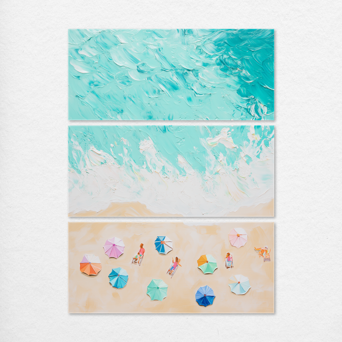 Turquoise waves meet sandy shores, establishing a serene and inviting mood perfect for coastal relaxation. The composition utilizes vibrant color contrast between the cool water and a cluster of colorful umbrellas, brought to life through textured surface details. This visual is ideal for adding a refreshing coastal vibe to living rooms, bedrooms, or patio spaces.