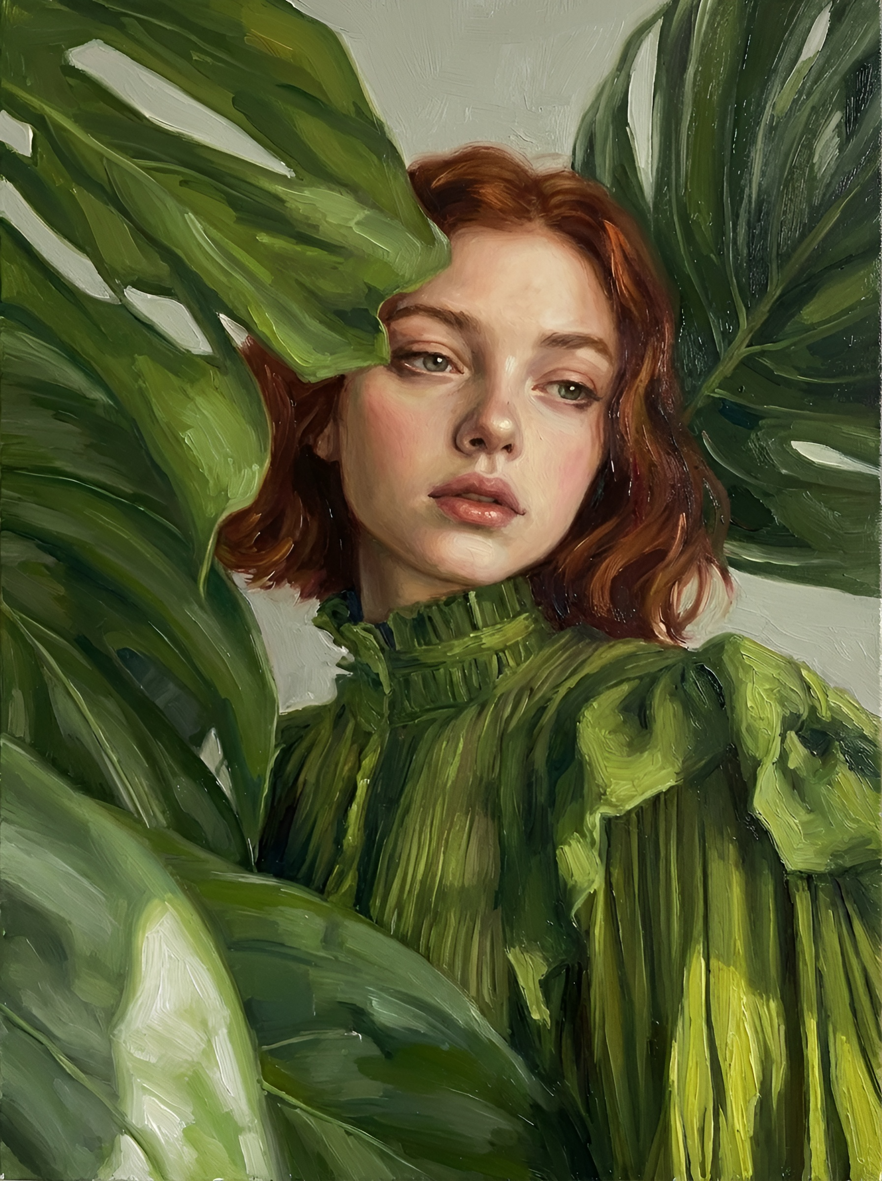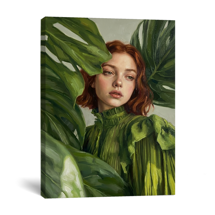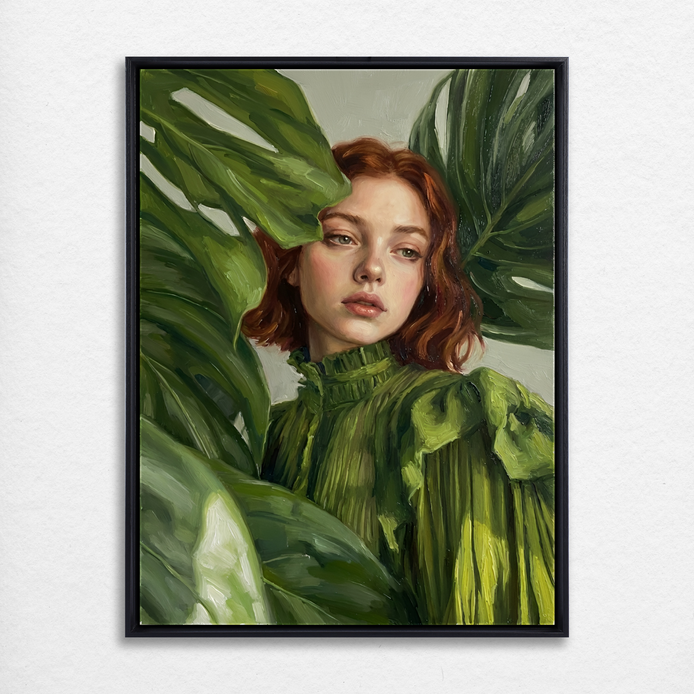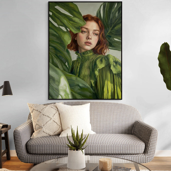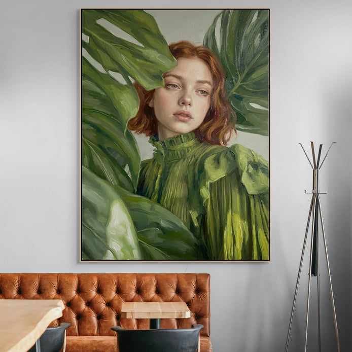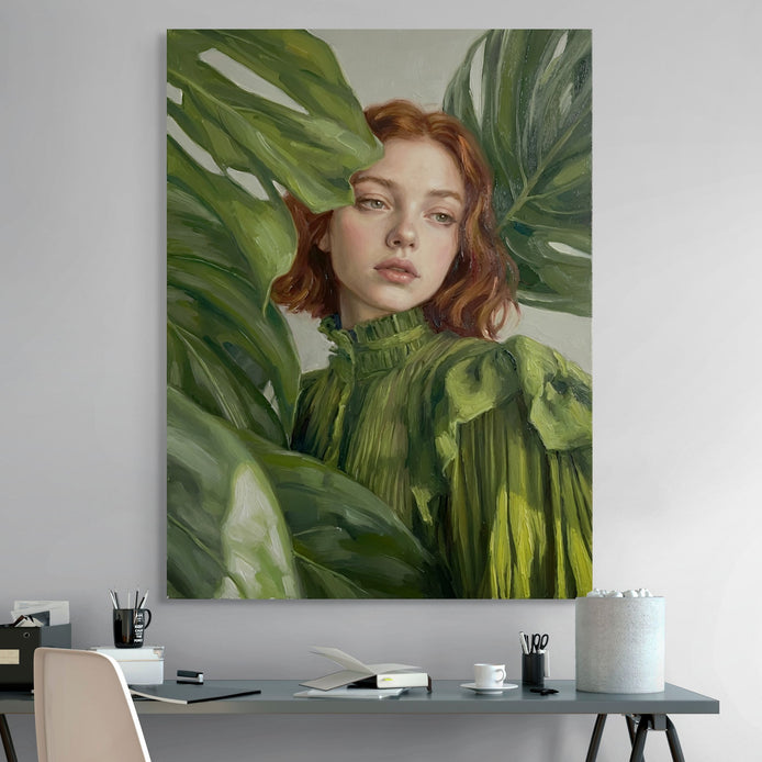 This artwork showcases a woman in striking green clothing partially hidden among large leaves, creating an intimate connection with nature. This wall art adds a vibrant touch to any decor. Ideal for decorating living rooms, bedrooms, dining areas, hallways, or offices, and a perfect choice for stylish home decor or a meaningful gift.