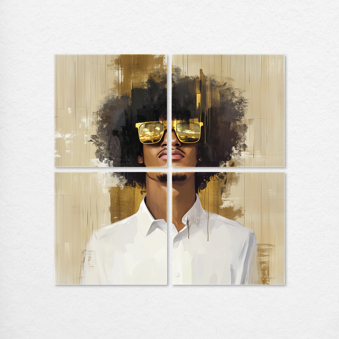 This striking portrait captures quiet strength and modern elegance through a figure wearing reflective sunglasses, instilling a mood of intrigue and style. The composition features golden tones and nuanced textures that define the sleek, contemporary aesthetic. This visual statement is ideal for sophisticated decor in living rooms, bedrooms, dining areas, hallways, or man caves.