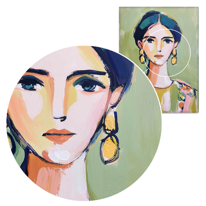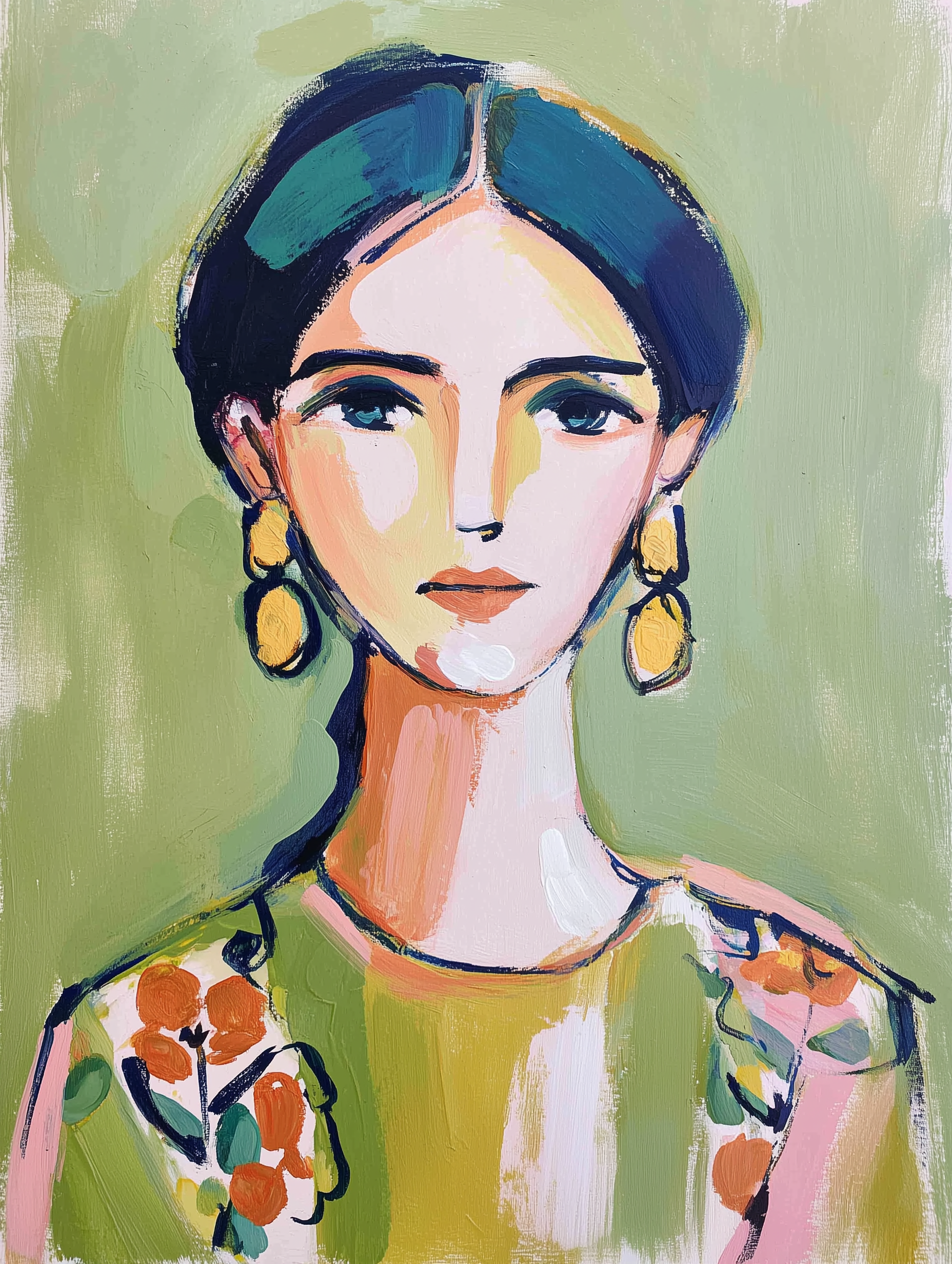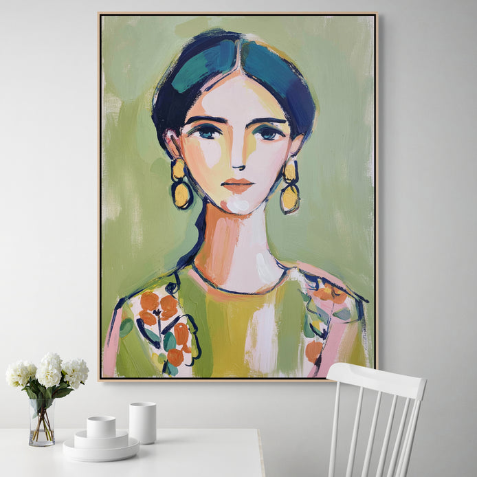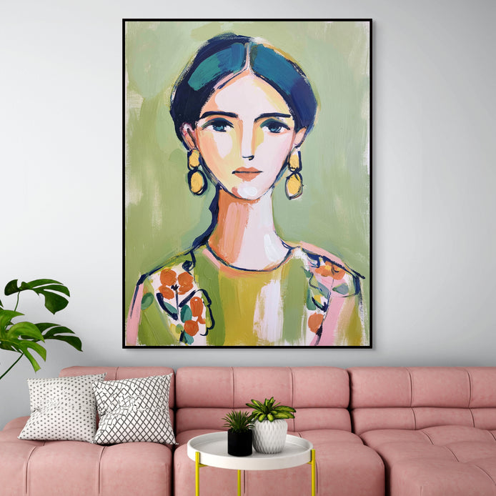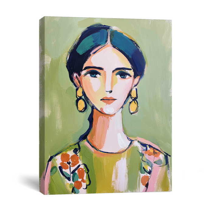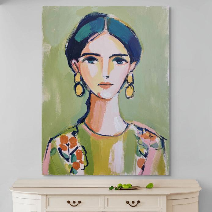 A woman with bright earrings and floral attire against a simple green background. A striking piece of wall art that adds a vibrant touch to any room. Ideal for decorating living rooms, bedrooms, dining areas, hallways, or offices, and a perfect choice for stylish home decor or a meaningful gift.