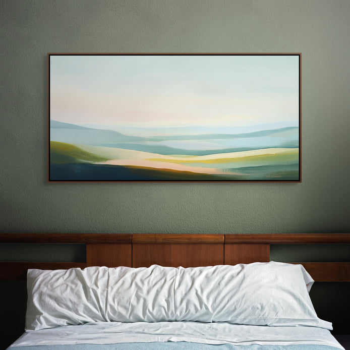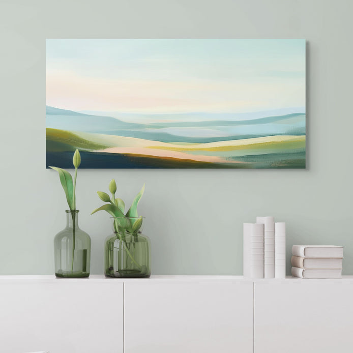 This hand-painted artwork captures a tranquil horizon, blending soft hues of green and blue. The soothing layers create a peaceful atmosphere, perfect for enhancing any room's decor.