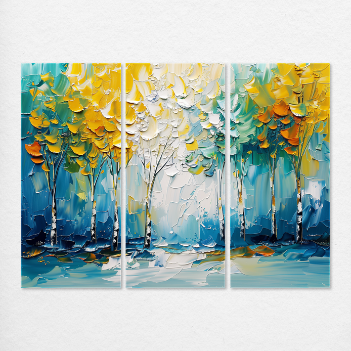 A golden forest shimmers under soft, ethereal light, instilling a mood of profound serenity and warmth. The composition utilizes a vibrant palette of warm hues and subtle texture, creating an ethereal focal point. This piece is ideal for enhancing the ambiance of living rooms, bedrooms, or sophisticated office spaces.