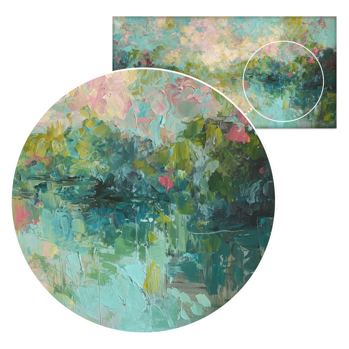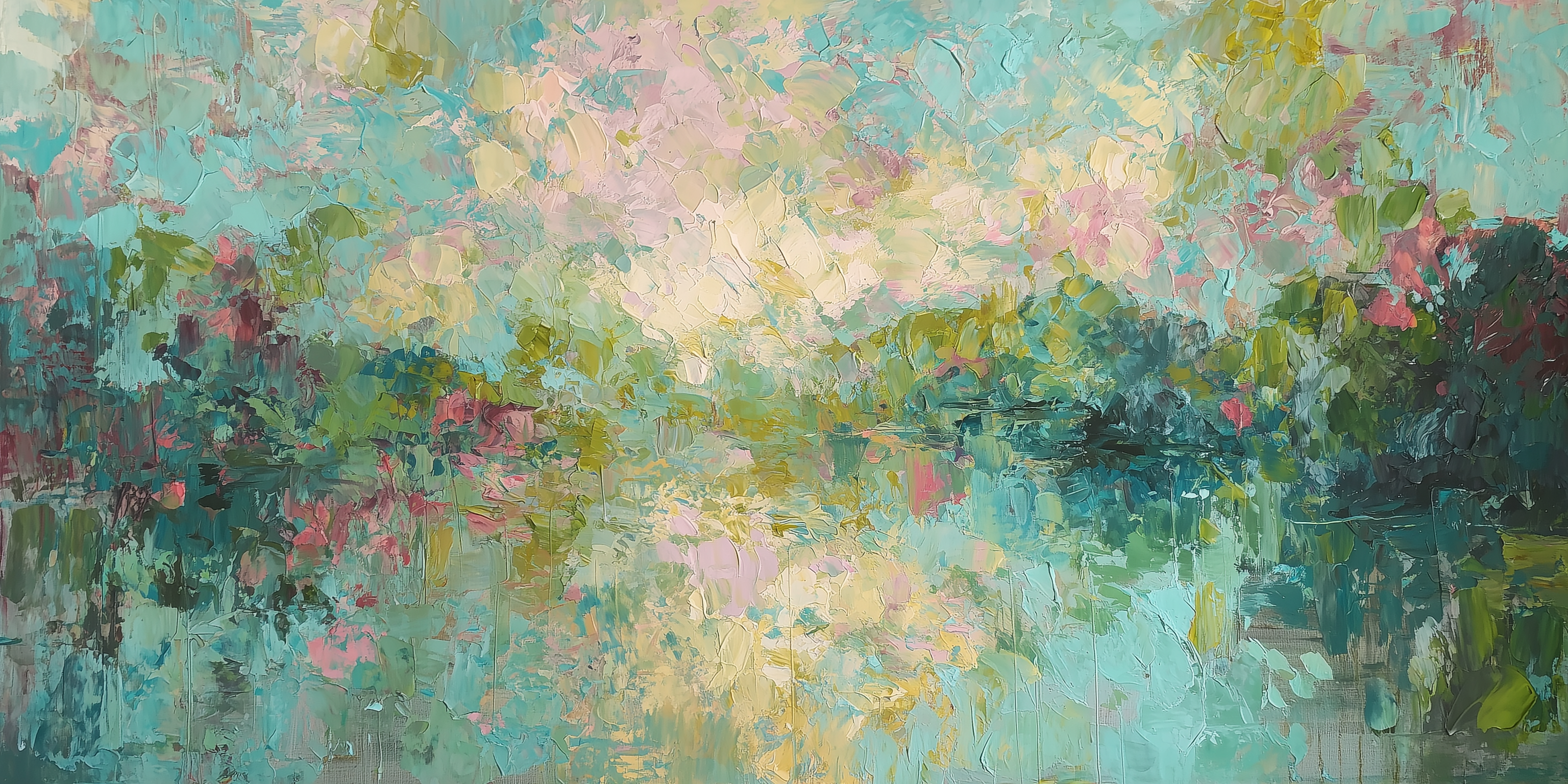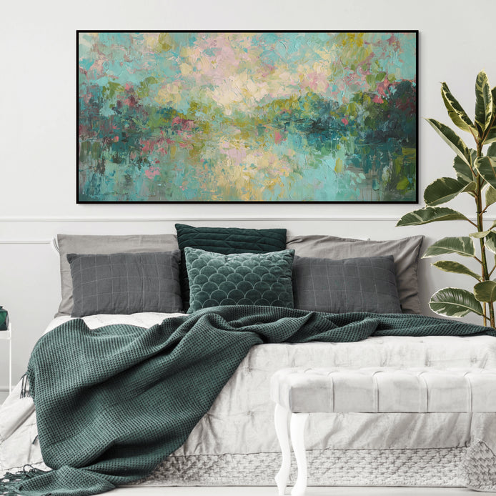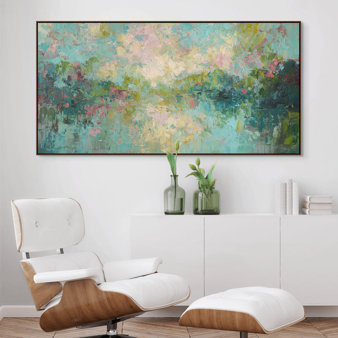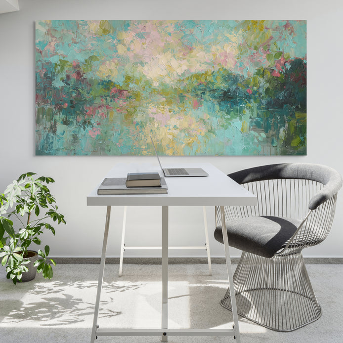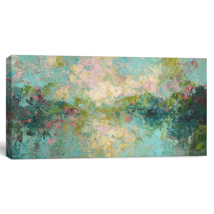 This colorful landscape scene instills a soothing atmosphere with gentle reflections on the water. The composition highlights shades of turquoise and green in a tranquil, nature-inspired design. It is an ideal statement piece for elevating living rooms, bedrooms, or offices.