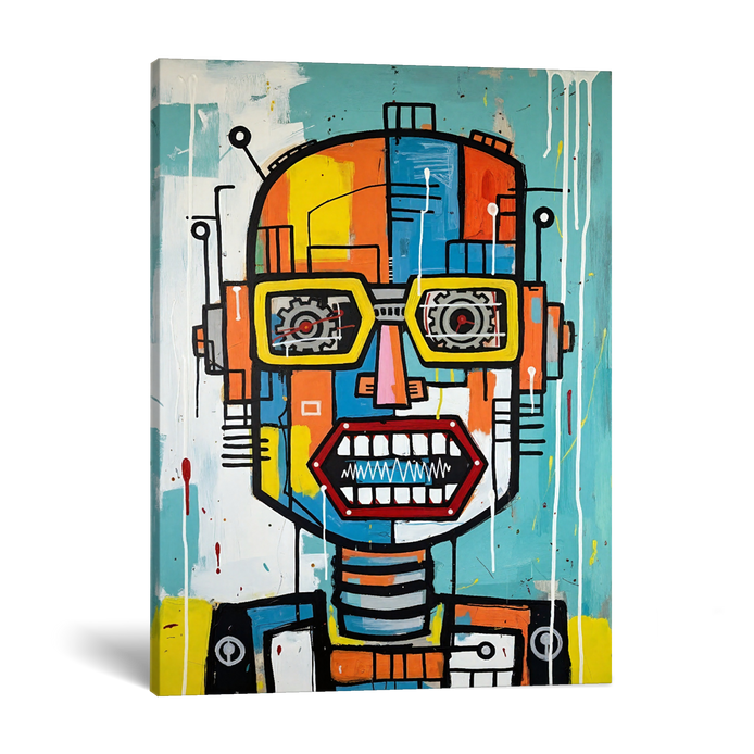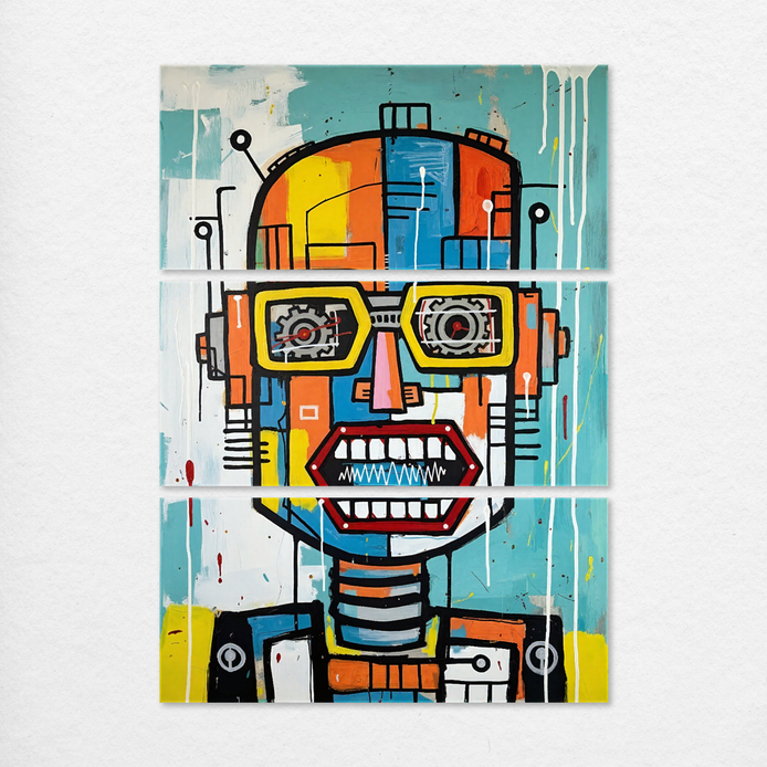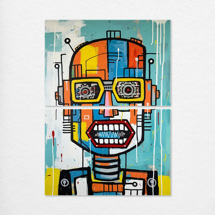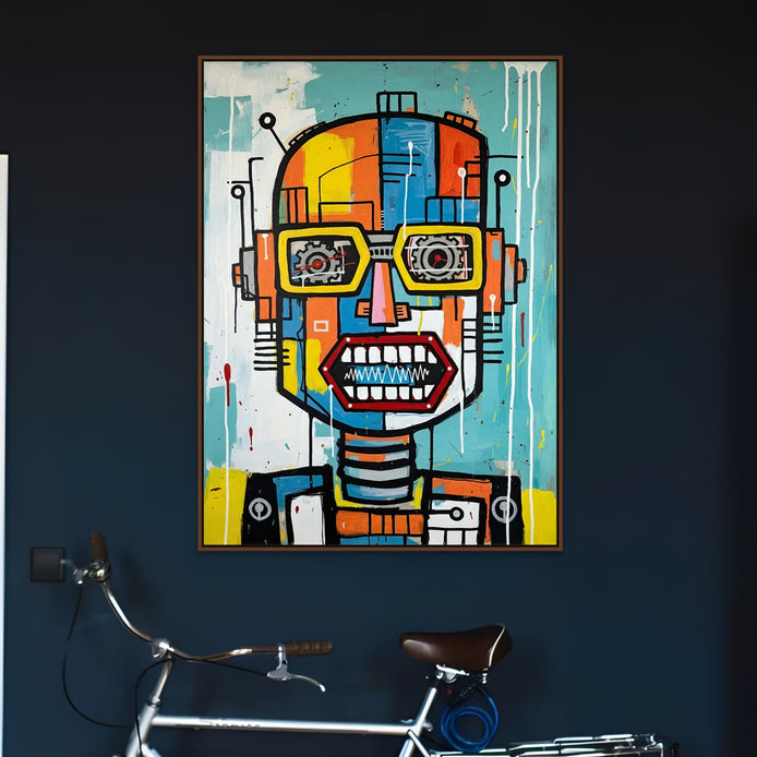 This striking hand-painted wall art showcases a colorful abstract face with bold features and expressive designs.