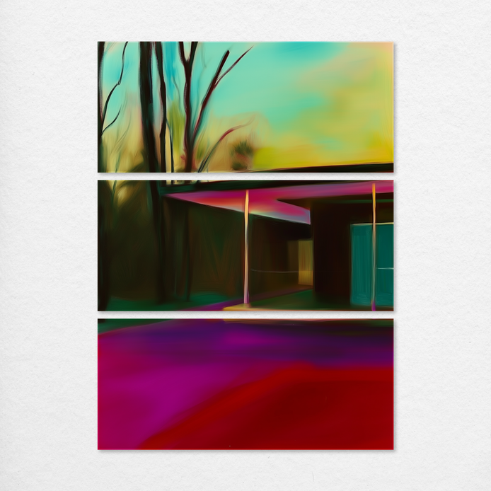A serene mid-century building stands amidst vibrant trees beneath a dreamy sky, evoking a sense of tranquil escapism. The composition utilizes clean lines and a retro aesthetic, presenting a harmonious blend of architectural form and nature's vivid color palette. This piece is an ideal addition to a sophisticated living room, bedroom, or home office.
