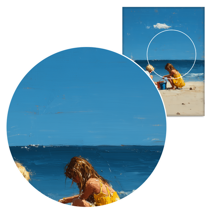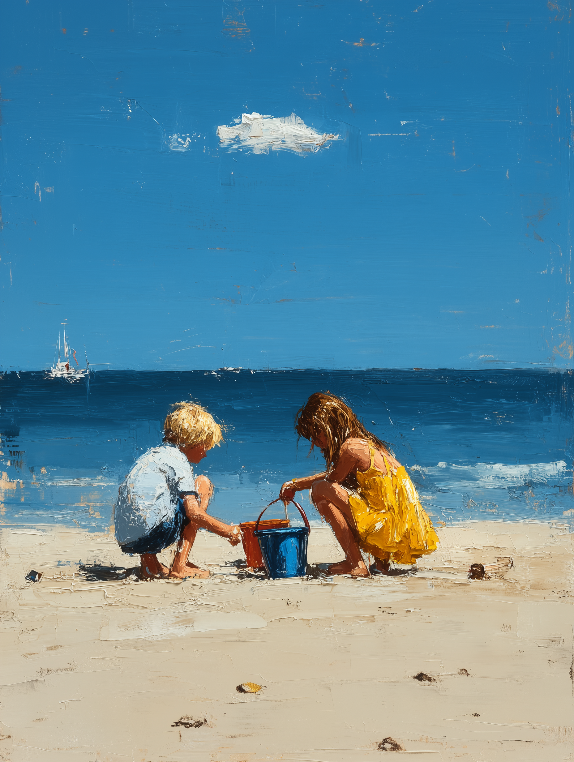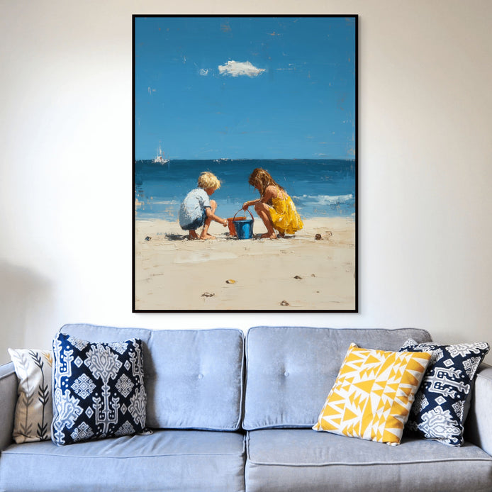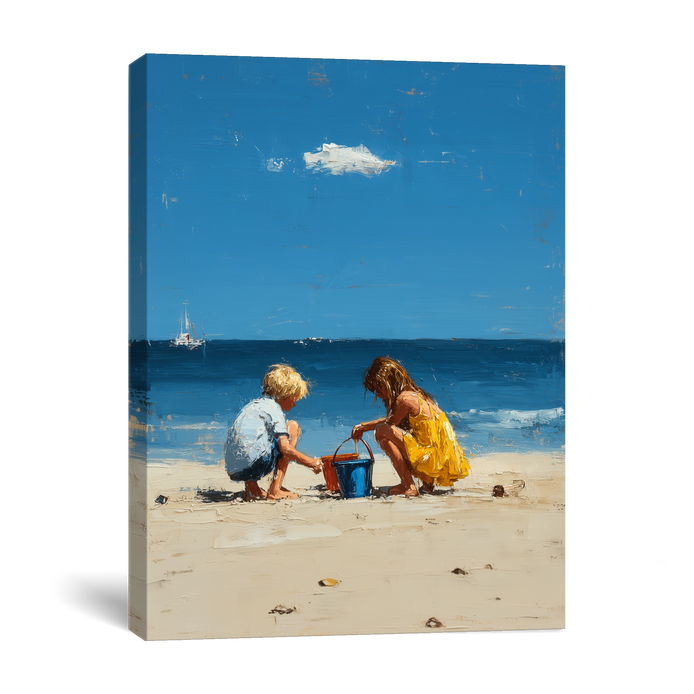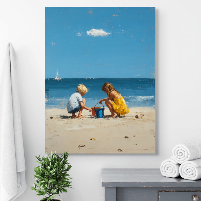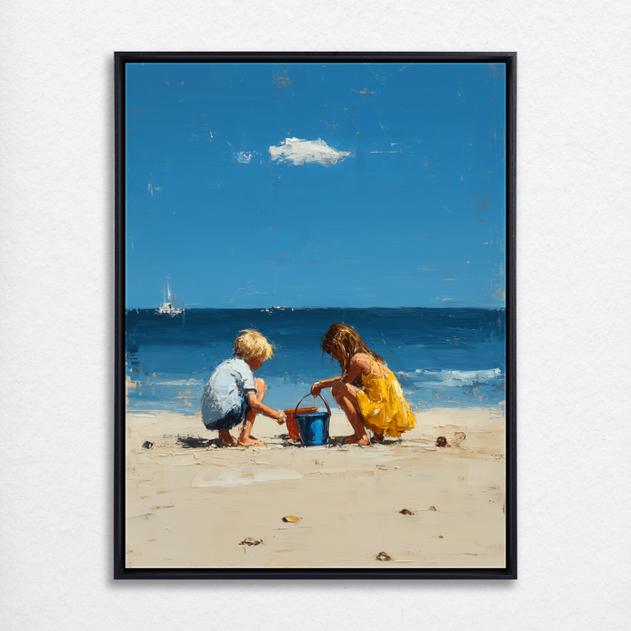 Two kids are engaged in play on the sandy beach near the water. They fill their buckets, enjoying a sunny day. This artwork captures joyful childhood moments beside the sea, perfect as wall art. Ideal for decorating living rooms, bedrooms, dining areas, hallways, or patio spaces, and a perfect choice for stylish home decor or a meaningful gift.