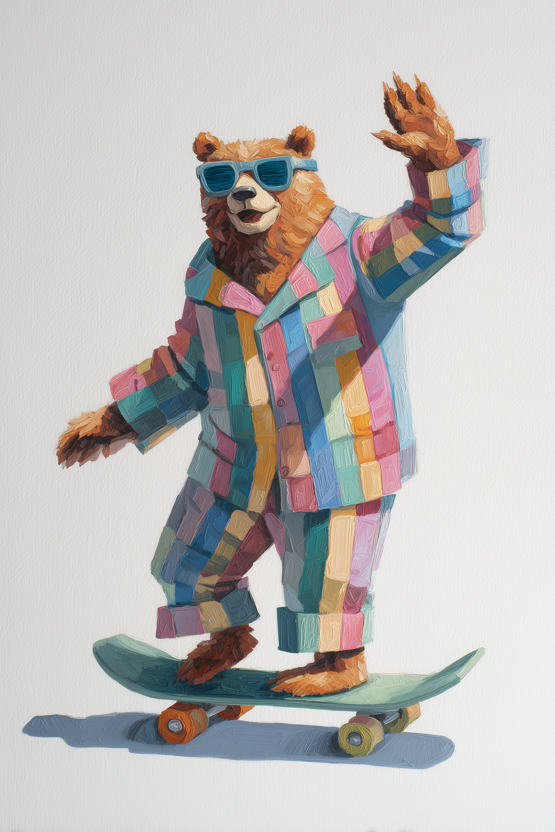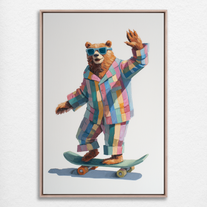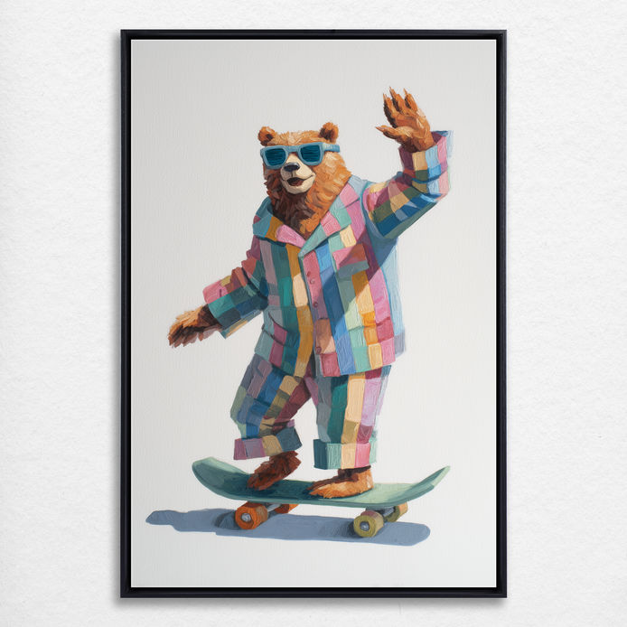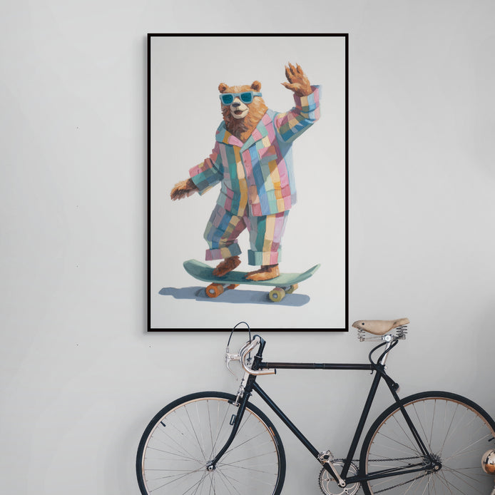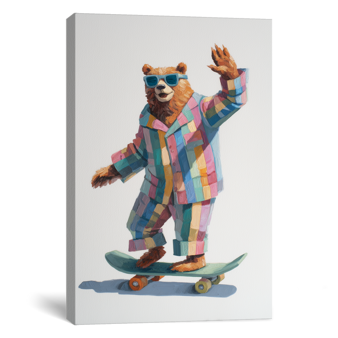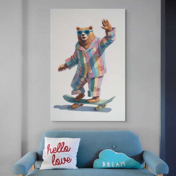 This unique hand-painted wall art features a bear dressed in a brightly colored suit, skateboarding with a cheerful wave. The lively colors and playful theme make it a captivating piece.