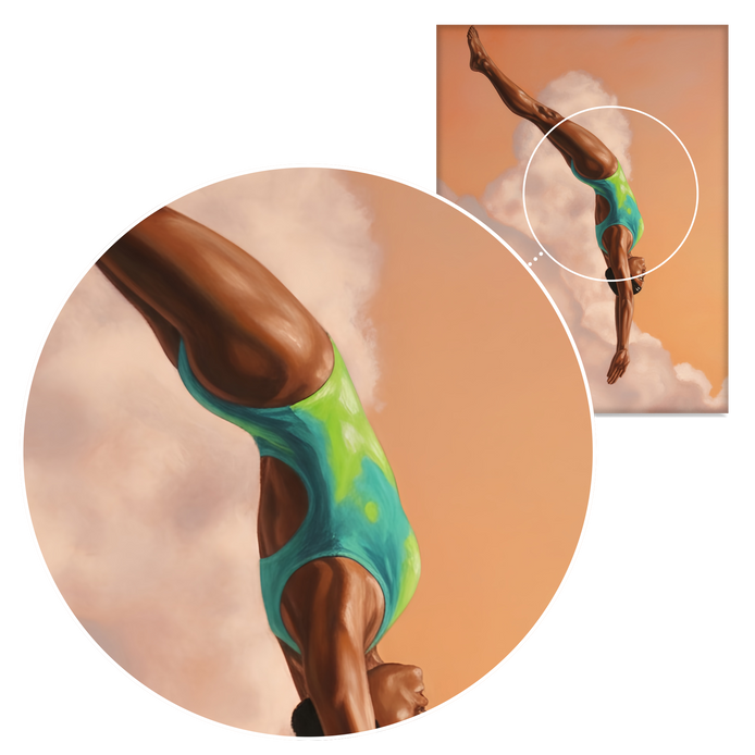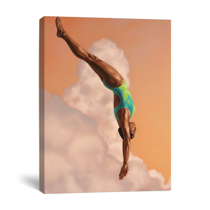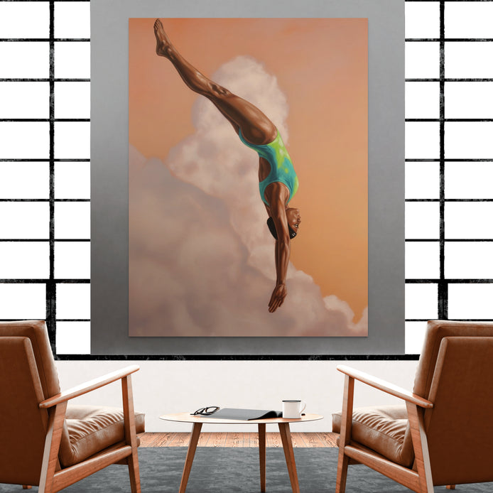 This vibrant hand-painted wall art captures a diver in mid-air, diving into a cloud-filled sky during a breathtaking sunset. The rich colors evoke a sense of freedom and adventure.