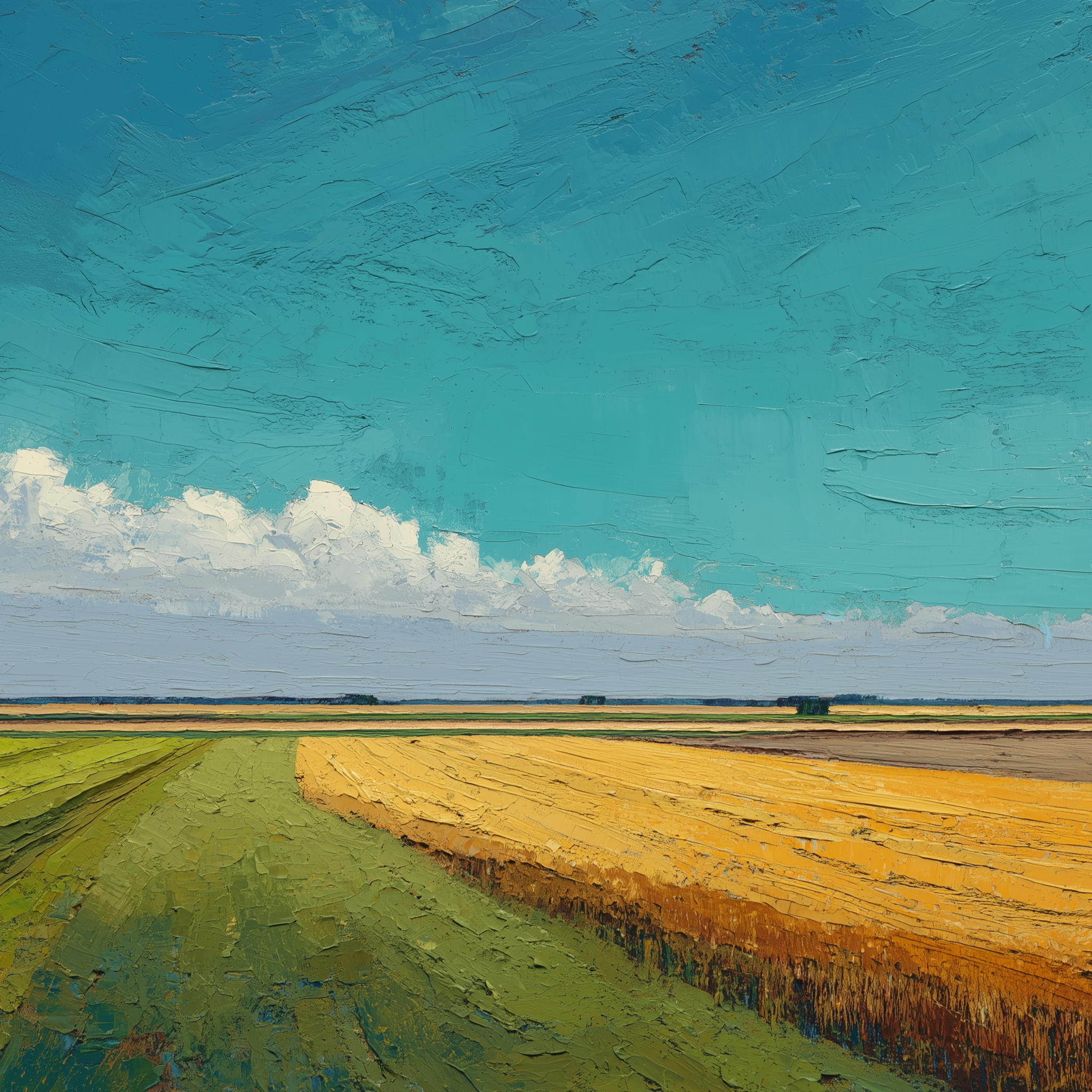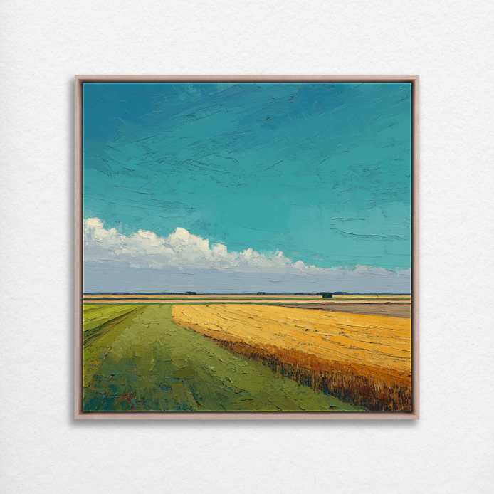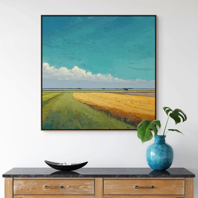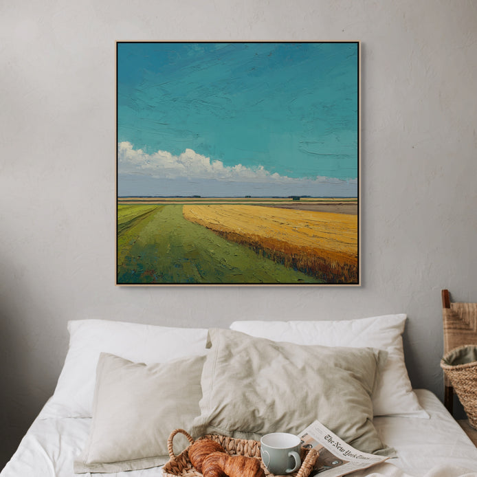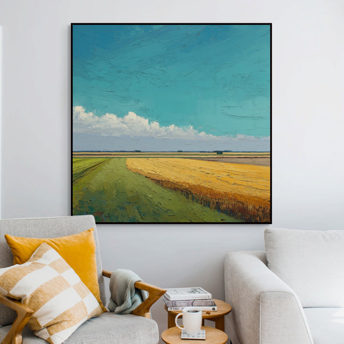 This hand-painted wall art captures a serene landscape featuring golden wheat fields stretching beneath a vivid blue sky dotted with fluffy clouds. The artwork showcases natural beauty and texture.
