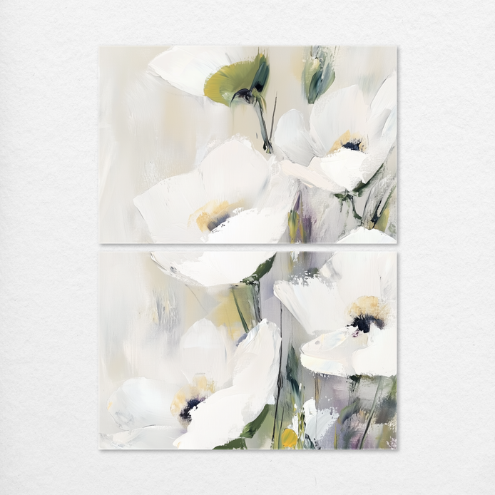 Hand-painted wall art whispers beauty as delicate white blooms float across a muted background, bringing softness and light to the space.