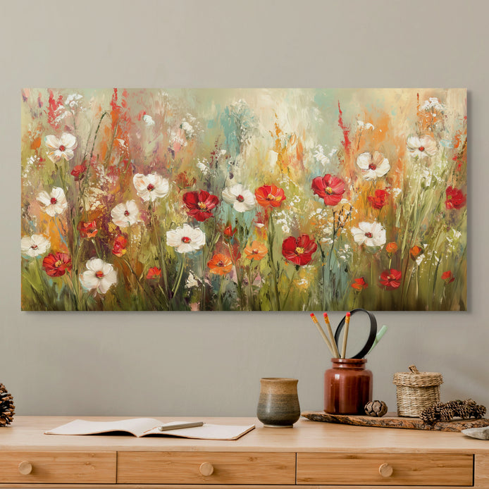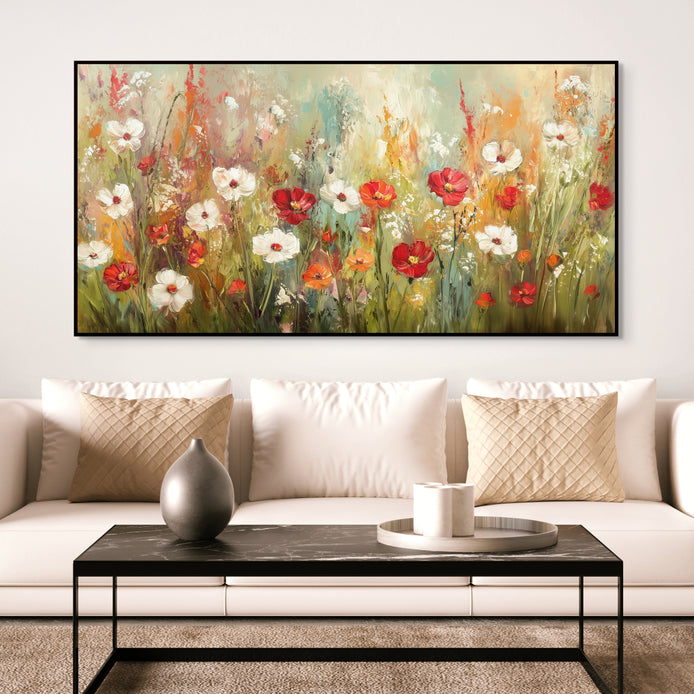 This captivating hand-painted wall art features a lush garden of blossoms in vibrant hues. The expressive strokes bring to life a lively display of flowers, creating a joyful atmosphere.
