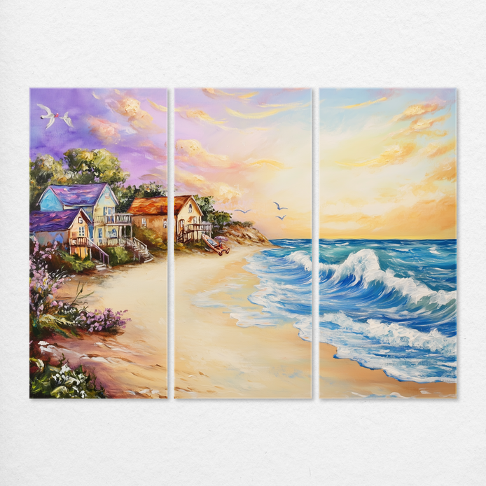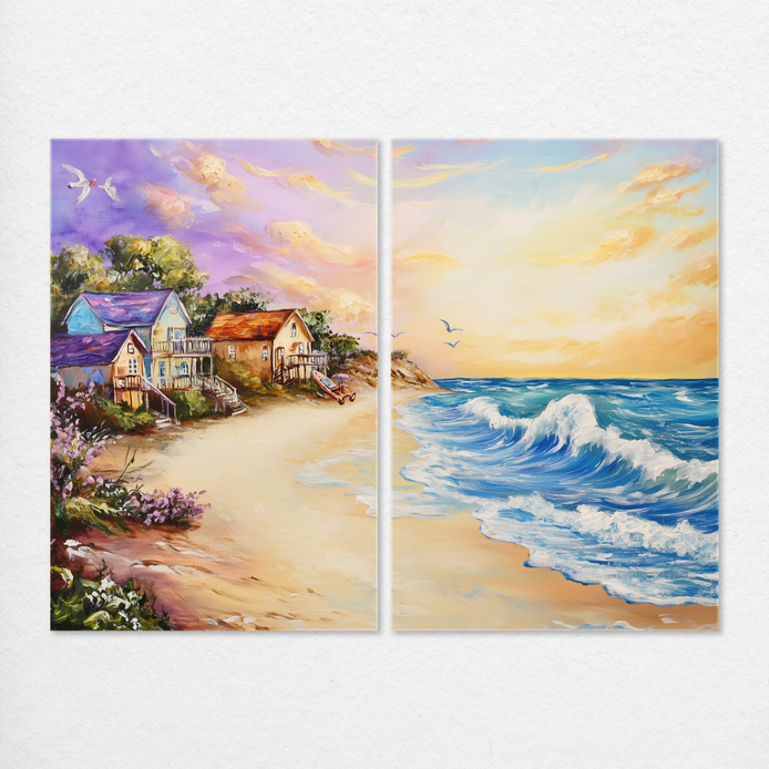 This charming seaside scene evokes peaceful nostalgia and warmth with cozy beach cottages and rolling waves. Soft sunset hues define the serene aesthetic, creating a tranquil and inviting composition. This piece is an ideal statement for a living room, bedroom, or patio space.