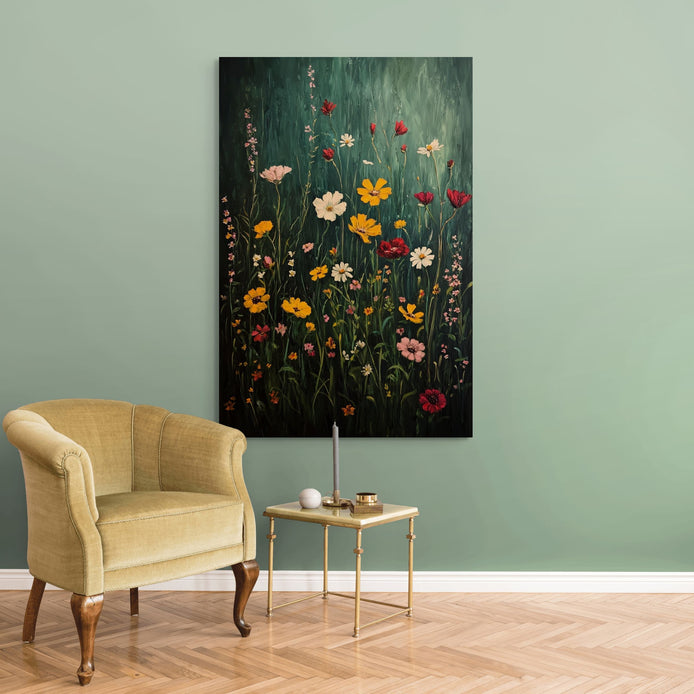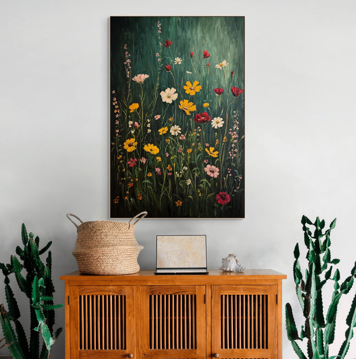 This hand-painted wall art features a lush garden brimming with vibrant flowers in various colors, highlighting nature's beauty. Each bloom is meticulously crafted to bring life to any setting.