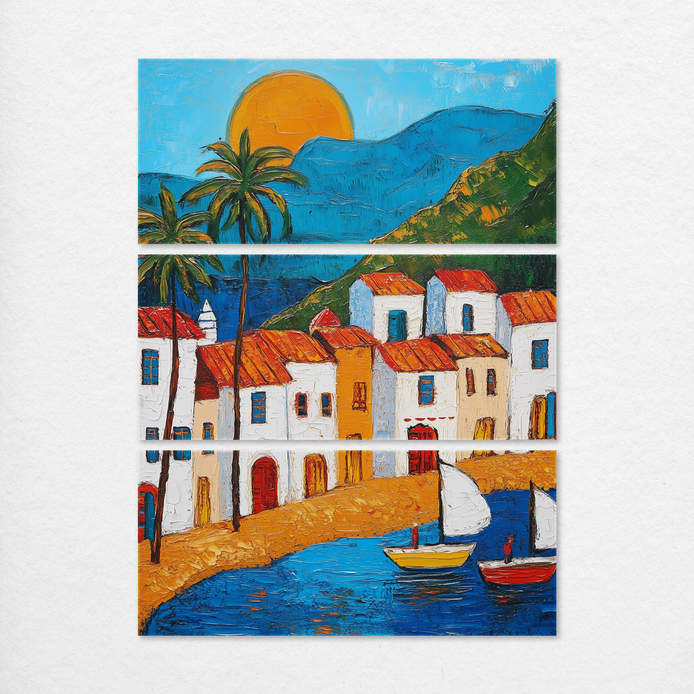 A lively coastal village captures the cheerful, relaxed mood of a golden sunset. The vibrant scene features whitewashed homes, tropical palm trees, and colorful sailboats, rich with maximalist detail and warmth. This piece is an ideal decorative statement for living rooms, dining areas, hallways, or offices.