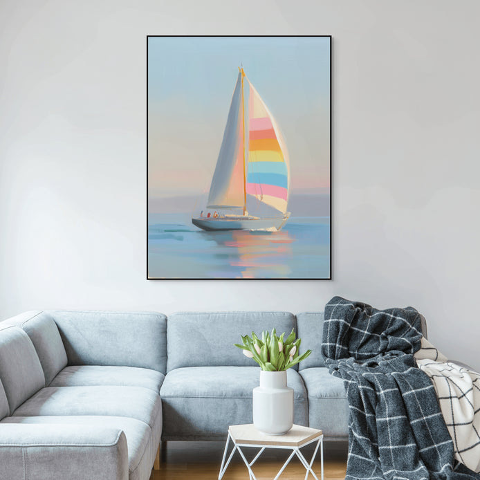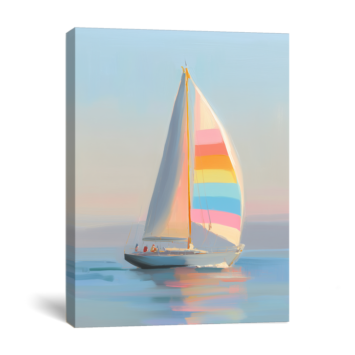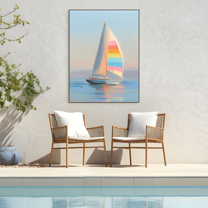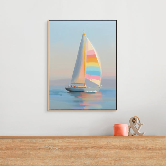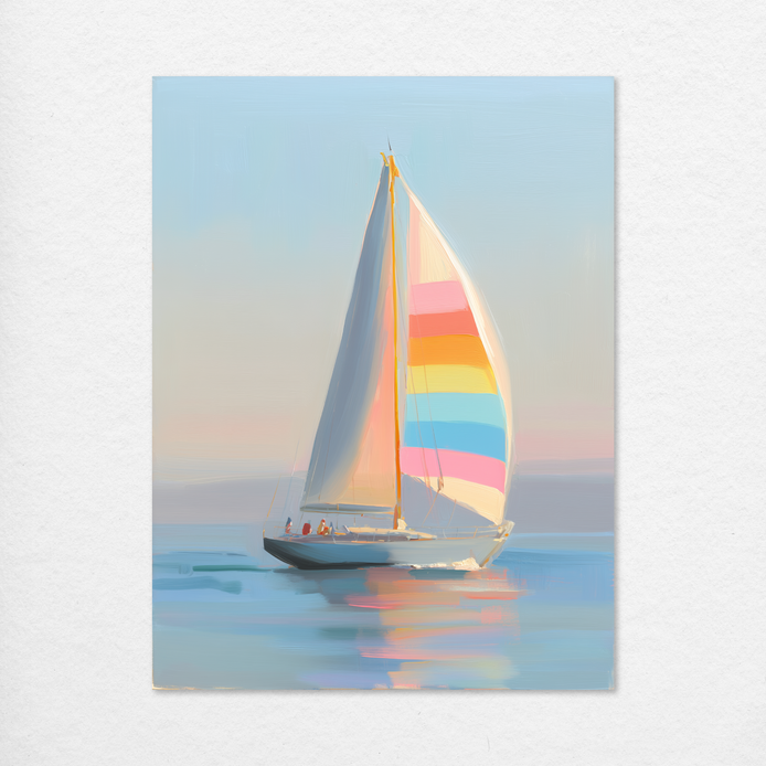 This hand-painted wall art showcases a vibrant sailboat navigating calm waters during a serene sunset. The colorful sail adds a playful touch to the peaceful scene. Perfectly captures tranquility.