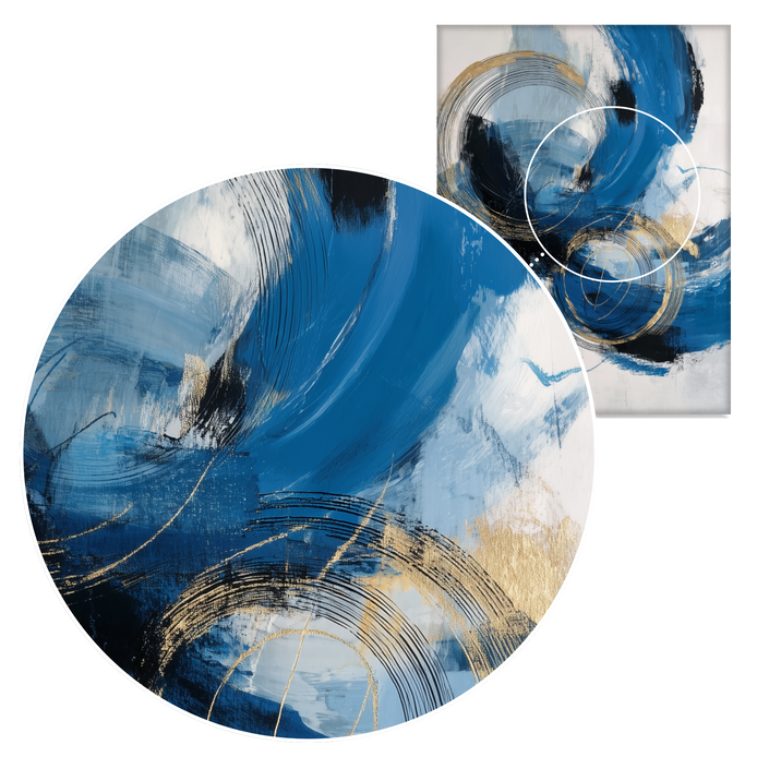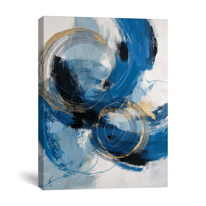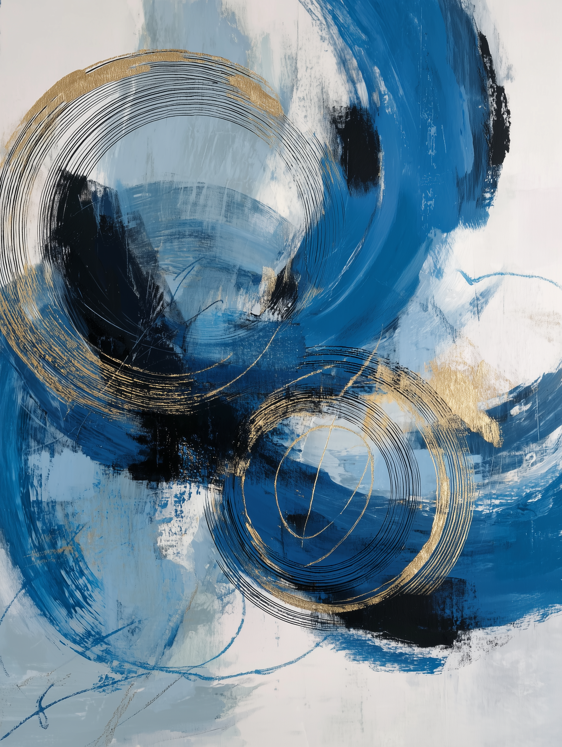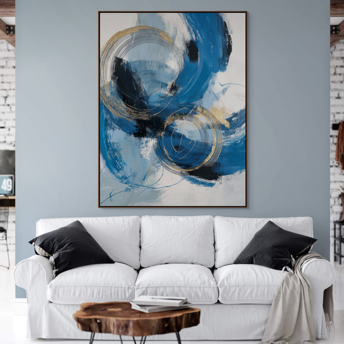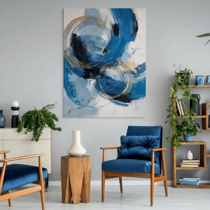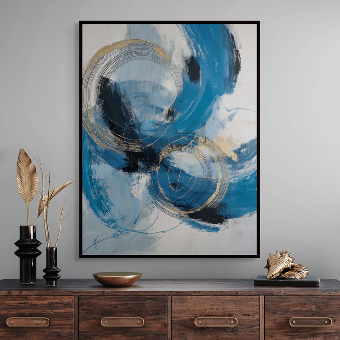 This hand-painted wall art features bold blue swirls accented with gold, creating a striking abstract design. Perfect for adding a touch of modern elegance to any space.