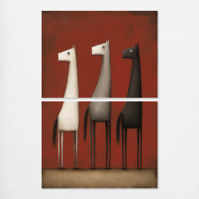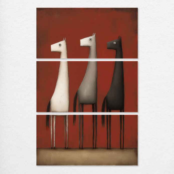 Three distinctive horses command attention, radiating strength and contemporary elegance. The composition features a dynamic contrast of striking figures against a vibrant red backdrop, utilizing bold forms to define a powerful focal point. This statement piece is ideal for energizing living rooms, bedrooms, or sophisticated man caves.