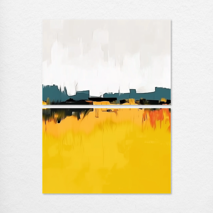 Bold strokes of golden yellow and deep teal collide beneath a pale sky, capturing the vibrant energy of a summer breeze drifting across an open field. A lively, expressive hand-painted piece full of motion.