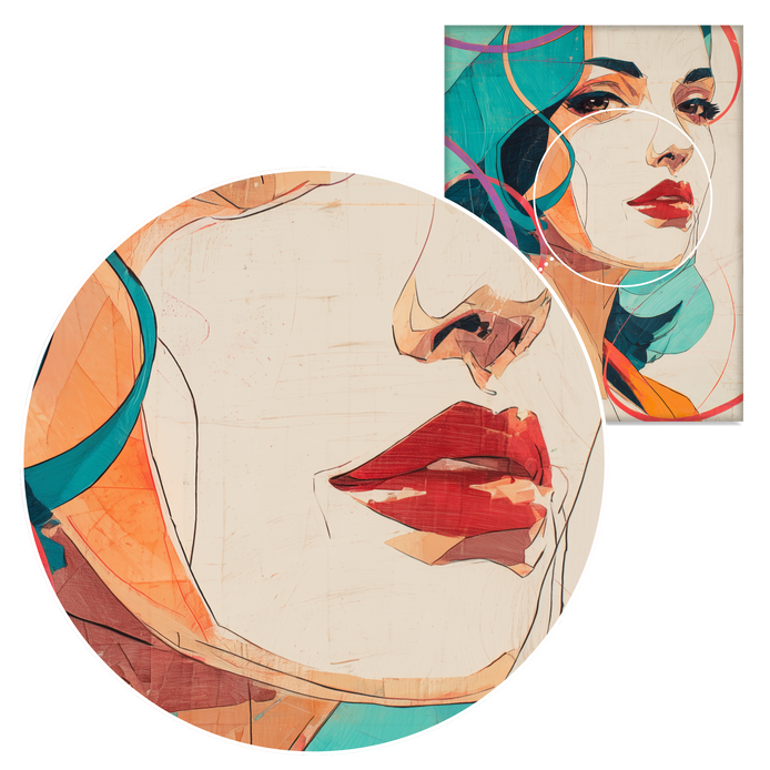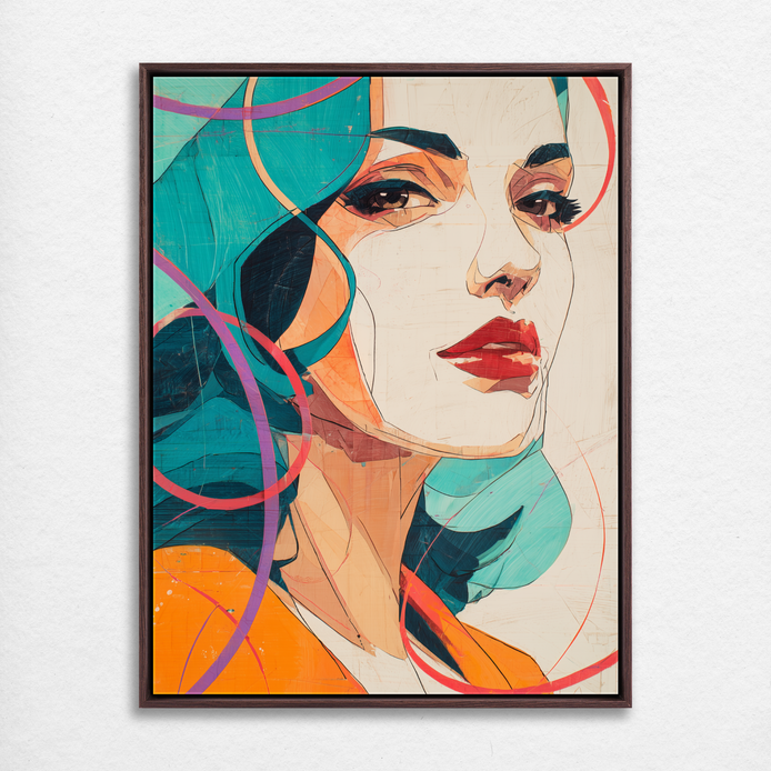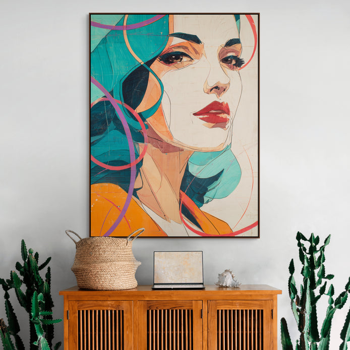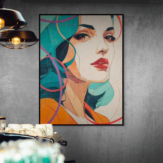 This striking modern portrait features a woman with turquoise hair and bold facial features, creating an eye-catching, vibrant mood. The composition utilizes abstract lines and an energetic color palette to form a dynamic contemporary design. This piece is ideal for adding a bold visual statement to living rooms, bedrooms, or man caves.