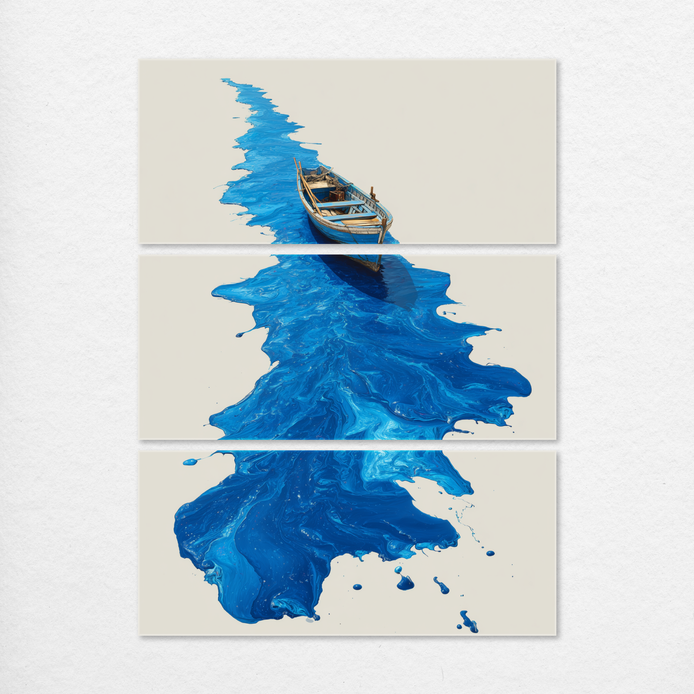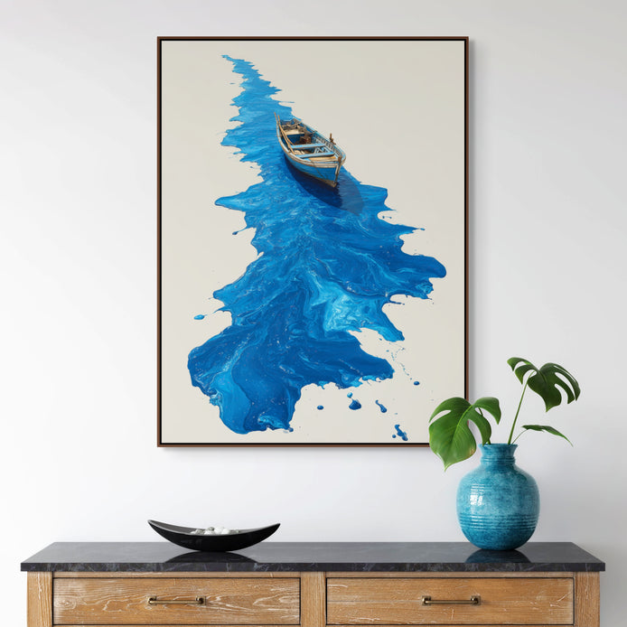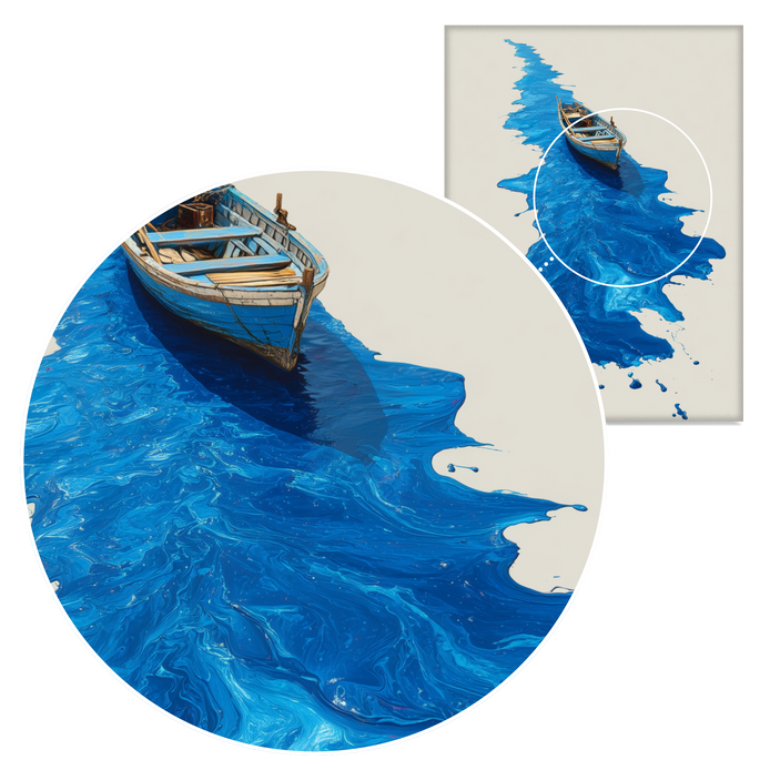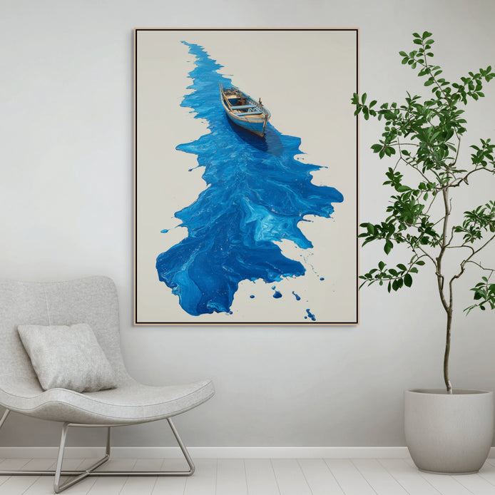 This hand-painted wall art captures a boat gliding atop vibrant blue waves, showcasing mesmerizing fluid patterns. The original artwork highlights the beauty of the sea in a modern style.
