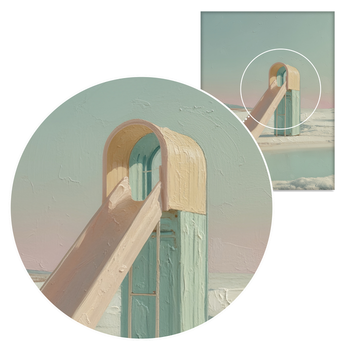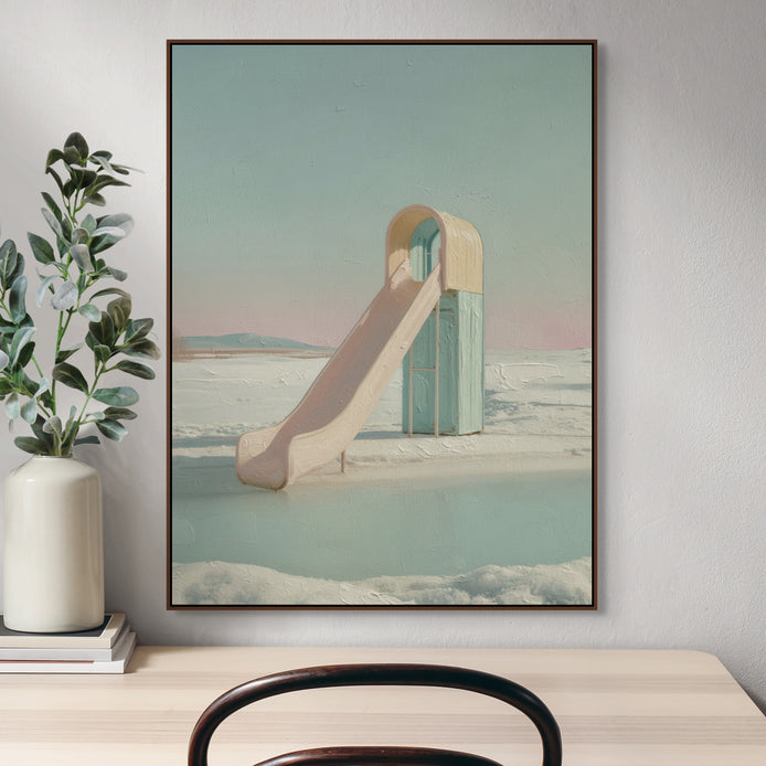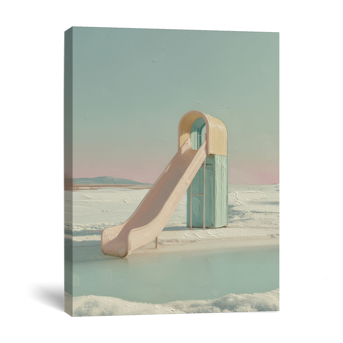 This hand-painted wall art showcases a pastel-colored slide standing on a peaceful area, illuminated by soft morning light. The serene backdrop enhances its playful charm.