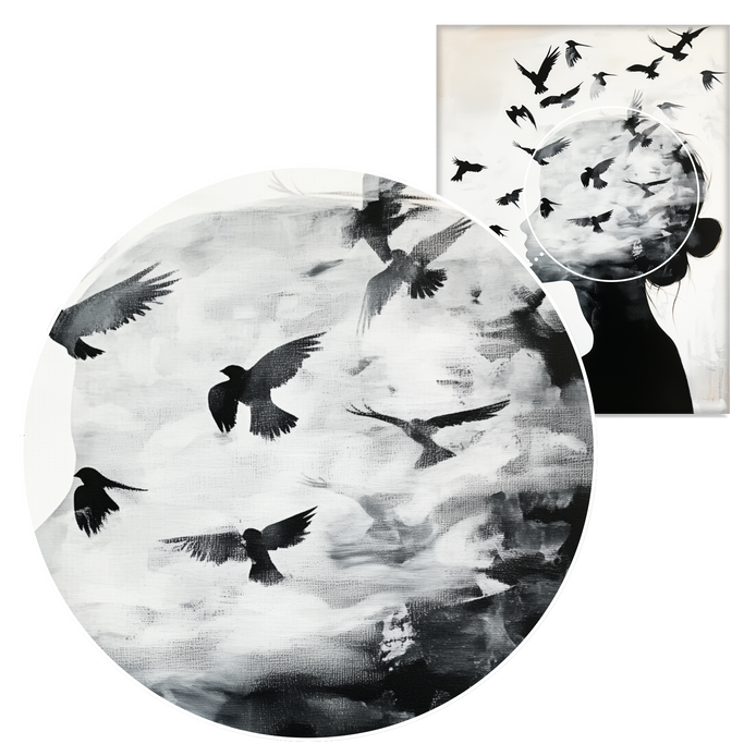 A surreal hand-painted portrait of a woman's silhouette seamlessly blending with a flock of birds in flight. This black-and-white masterpiece captures the unbound nature of imagination, celebrating freedom, introspection, and the power of the mind.