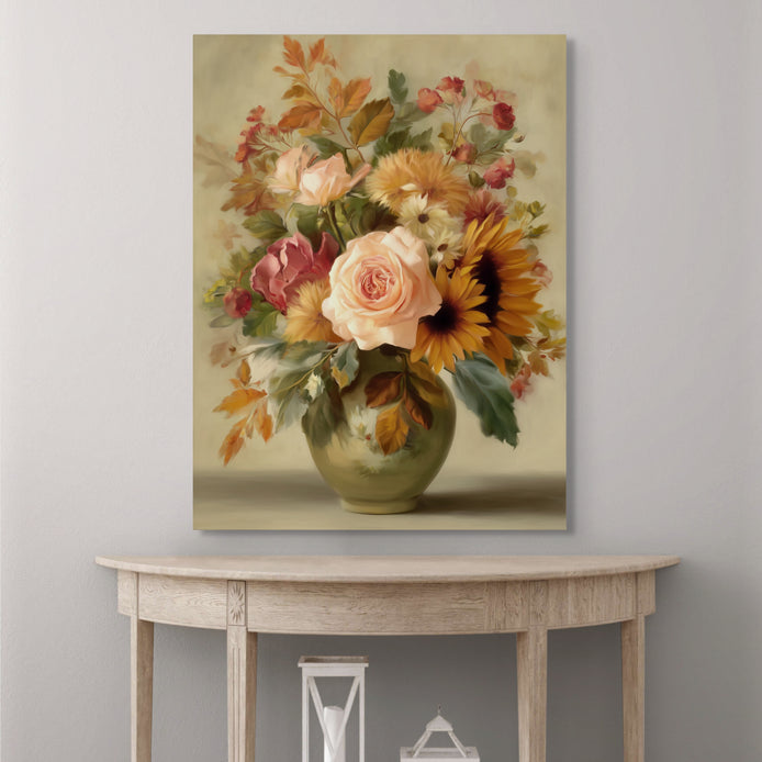 This exquisite bouquet of sunflowers and roses conveys a warm, inviting, and vibrant atmosphere. The composition features rich, autumnal colors of the flowers and surrounding fall leaves, creating a detailed and classically elegant style. This visual is ideal for adding warmth to a living room, dining area, hallway, or kitchen.