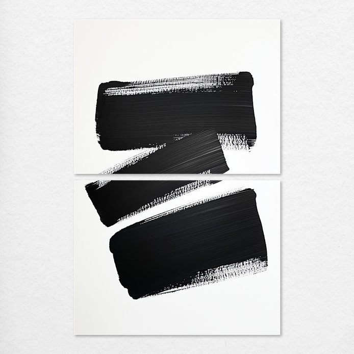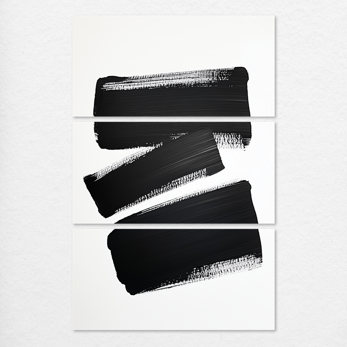 Three expressive black forms deliver a striking visual contrast and dynamic, minimalist mood. The composition features deep black elements against a pristine white field, offering a bold and modern aesthetic. It is an ideal anchor piece for sophisticated living rooms, sleek offices, or minimalist hallways.