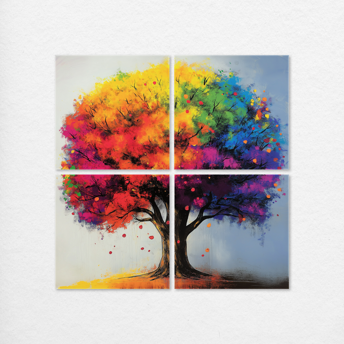 A rainbow-hued tree explodes with color, radiating warmth, imagination, and a vibrant, creative spirit. This maximalist composition features rich layers of expressive color, forming a dynamic statement piece. It is an ideal decor choice for energizing living rooms, dining areas, or kids’ rooms.