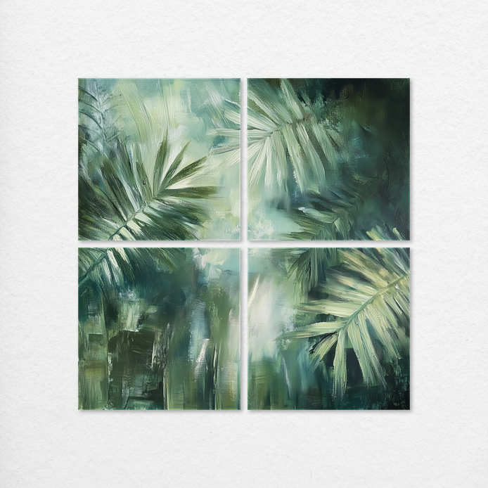 Lush hand-painted palm leaves in soft greens and muted tones bring a touch of exotic tranquility to any space.