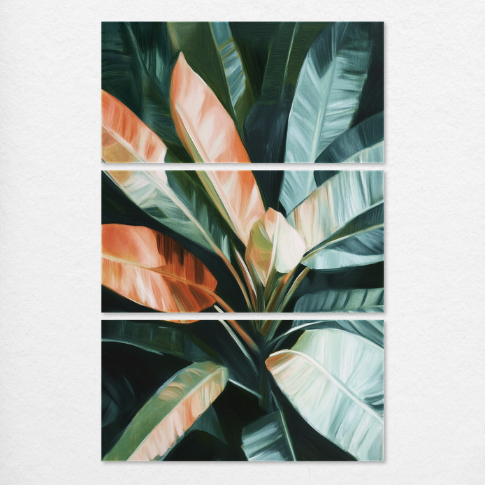 This captivating hand-painted artwork showcases vibrant leaves in varying shades of green and orange, beautifully blending realism and impressionism.