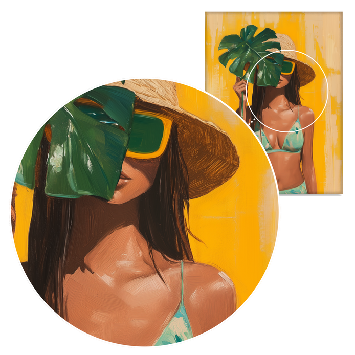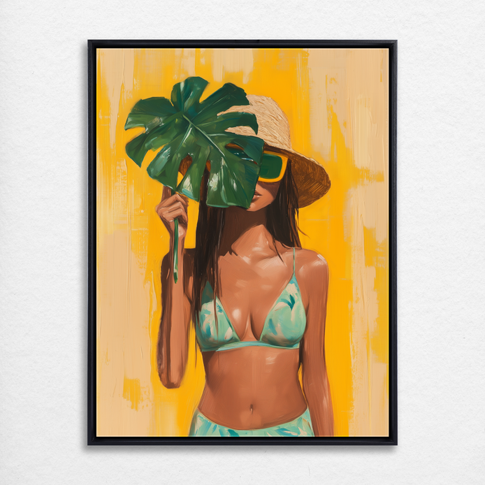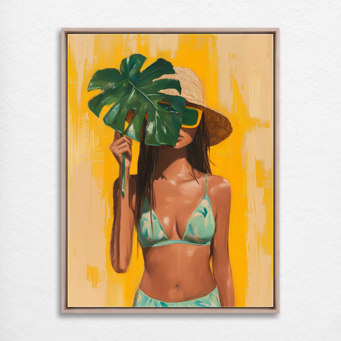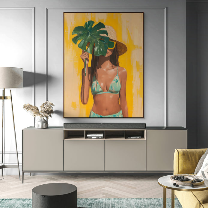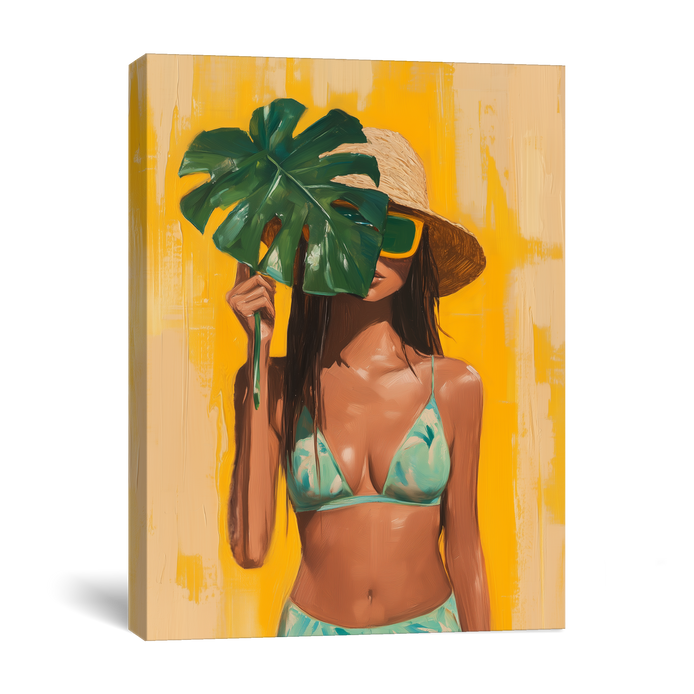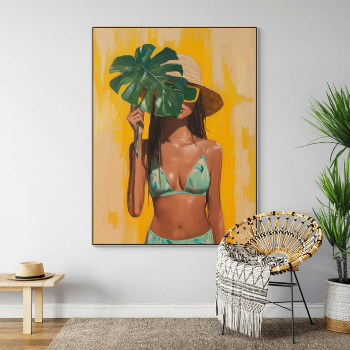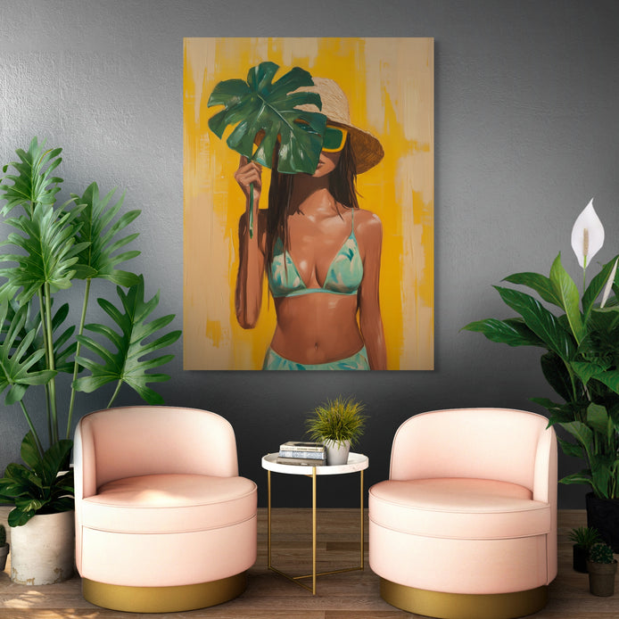 This hand-painted wall art captures a woman enjoying a sunny day in a vibrant yellow backdrop. Adorned in tropical swimwear and a straw hat, she playfully conceals her face with a large leaf.