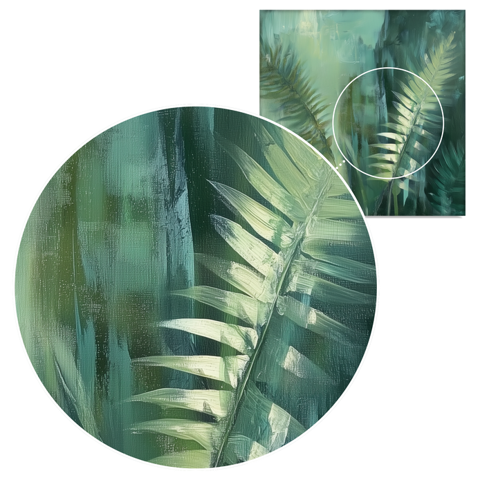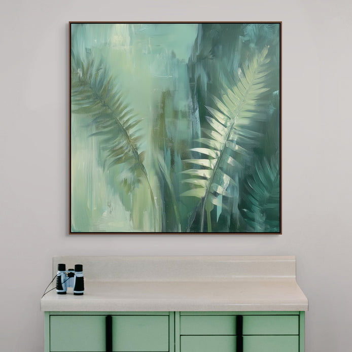 This hand-painted wall art showcases lush green ferns with soft brush strokes, creating a calming and abstract design. Perfect for nature lovers and those seeking serenity in their space.