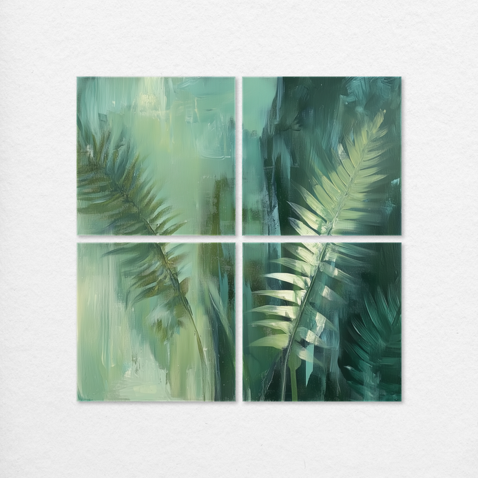 Lush green ferns define a tranquil, abstract composition, instilling a mood of profound serenity. The design utilizes soft texture and rich green hues, creating a calming, nature-inspired visual aesthetic. This piece serves as an ideal accent for enhancing living rooms, bedrooms, dining areas, hallways, or kitchens.