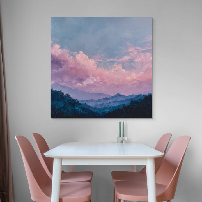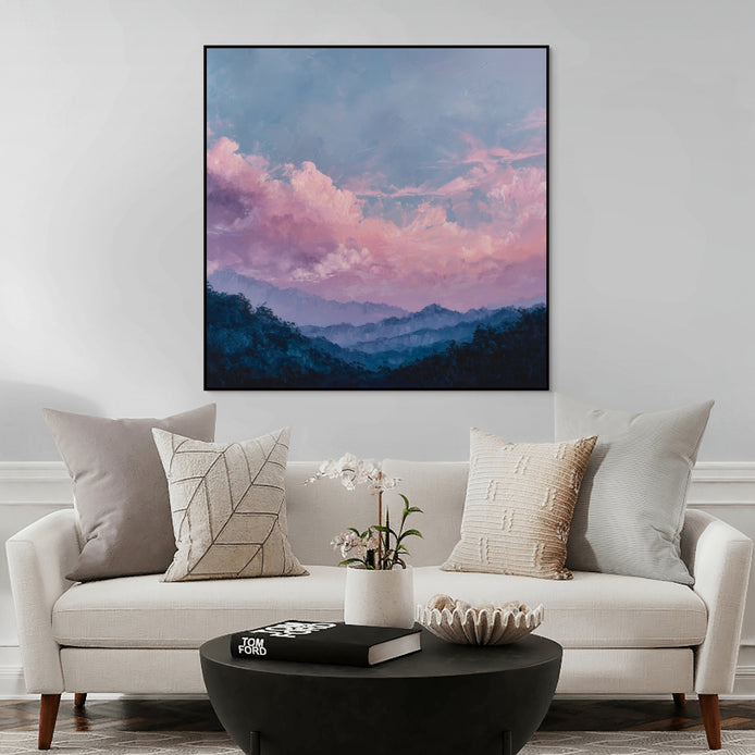 This hand-painted wall art portrays a tranquil mountain landscape at twilight, where soft pink clouds blend beautifully into the sky. The mountains are enveloped in calming colors and textures.