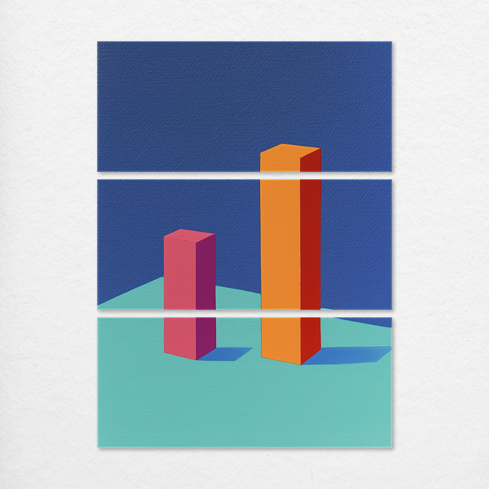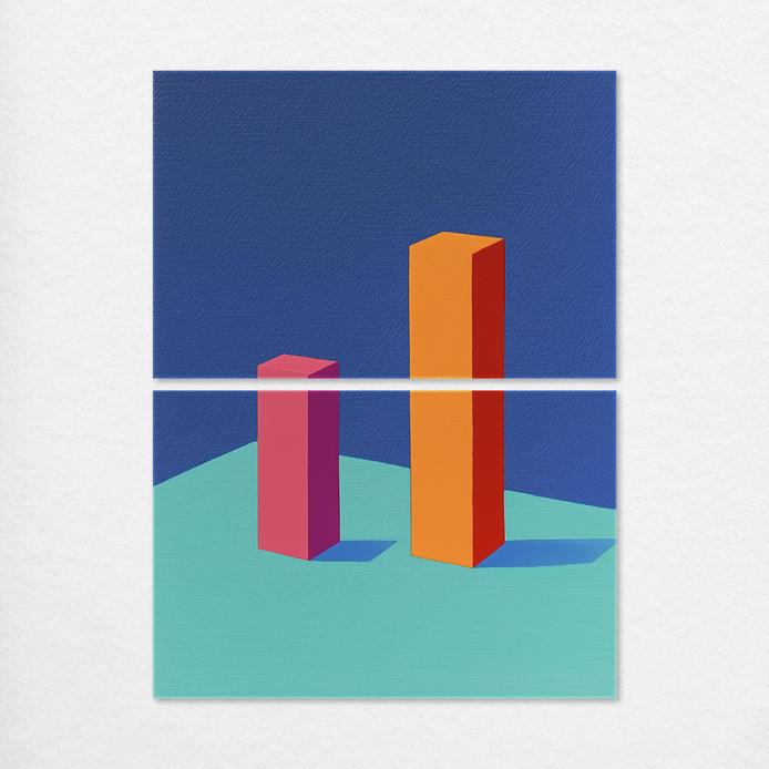 This abstract pair of bold trapezoidal forms captures the tension between mass and space, blending vivid orange and rose against a cobalt backdrop.
