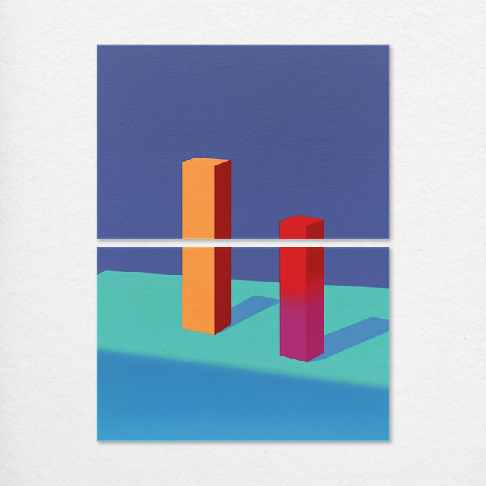 Saturated coral and tangerine columns rise in harmony, casting shadows across a calm cyan floor. A minimalist celebration of symmetry and contrast.
