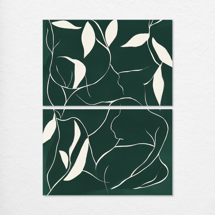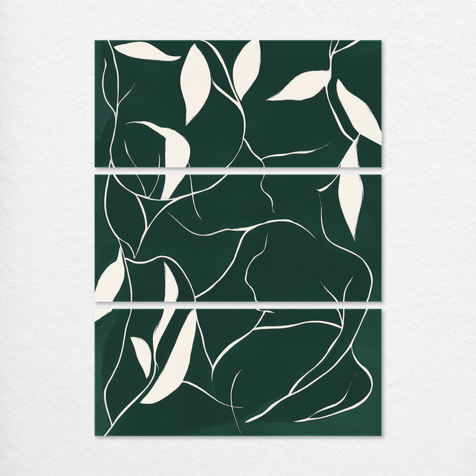 This hand-painted abstract piece intertwines white linework with organic leaf shapes against a deep emerald background. The composition blends modern design with natural inspiration, creating a harmonious and sophisticated visual effect.