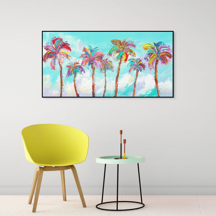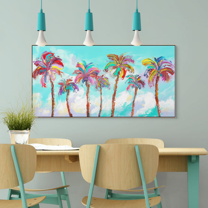 This hand-painted artwork showcases a lively grove of palm trees swaying under a bright turquoise sky. The colorful fronds create a joyful and tropical ambiance perfect for brightening any space.