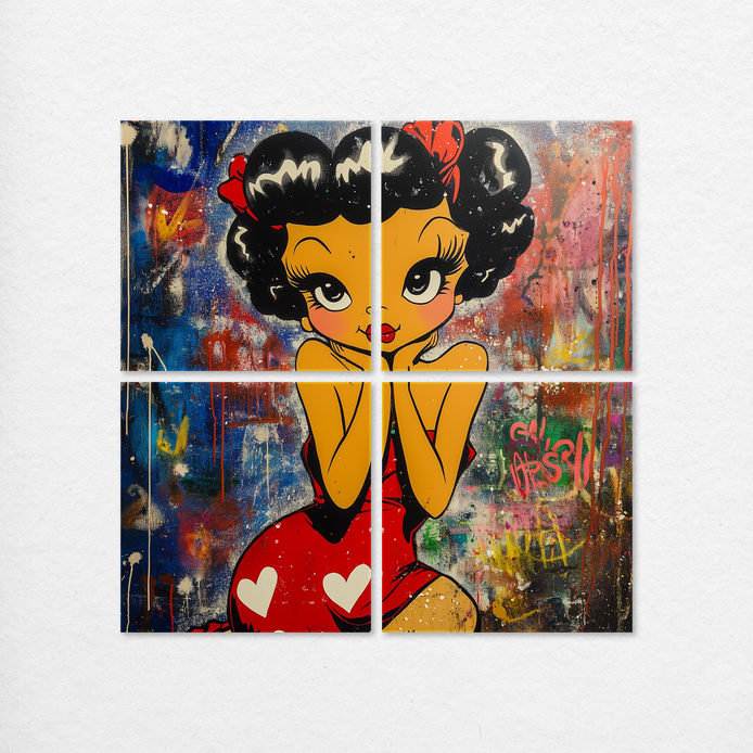 This piece captures a playful, vintage-inspired character, radiating charm through an enchanting smile. The retro composition features a soft palette and refined texture, embodying a sweet, nostalgic aesthetic. This visual is ideal for adding stylish decor to living rooms, bedrooms, or kids' rooms.
