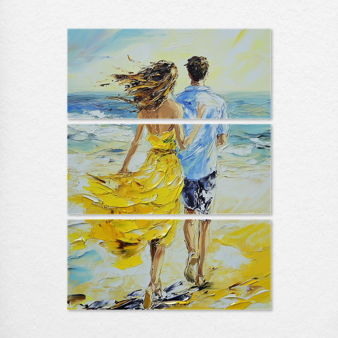 A couple strolls a golden shoreline, her dress caught in the sea breeze. This textured impasto hand-painted piece brings warmth and motion to any room.