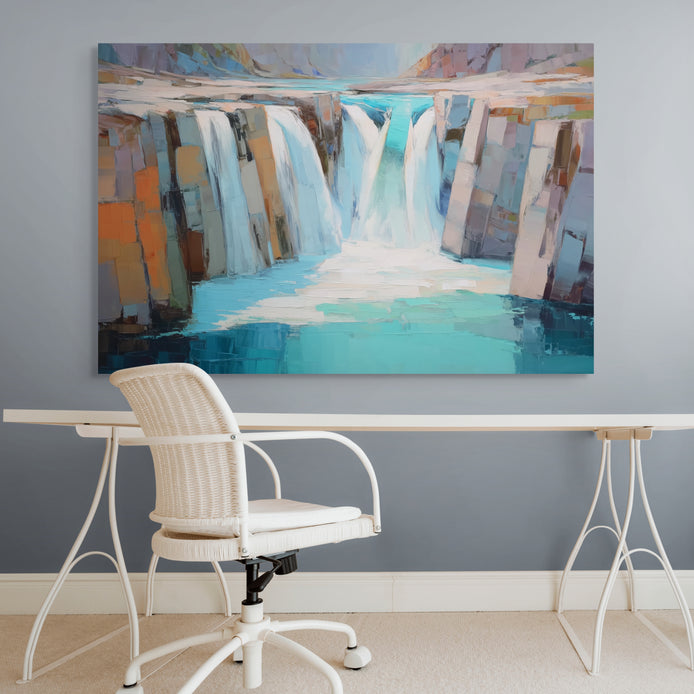 This hand-painted wall art showcases a stunning waterfall, where fresh water tumbles over rocky cliffs into a tranquil pool below.