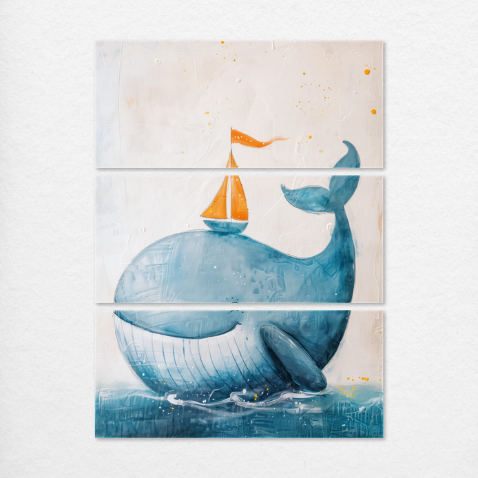 A dreamy and imaginative scene captures a smiling whale navigating the water with a tiny sailboat in tow, establishing a magical, lighthearted adventure. The composition uses soft pastels and expressive texture to convey a sense of wonder. This enchanting piece is ideal for elevating bedrooms, living rooms, or children's spaces.