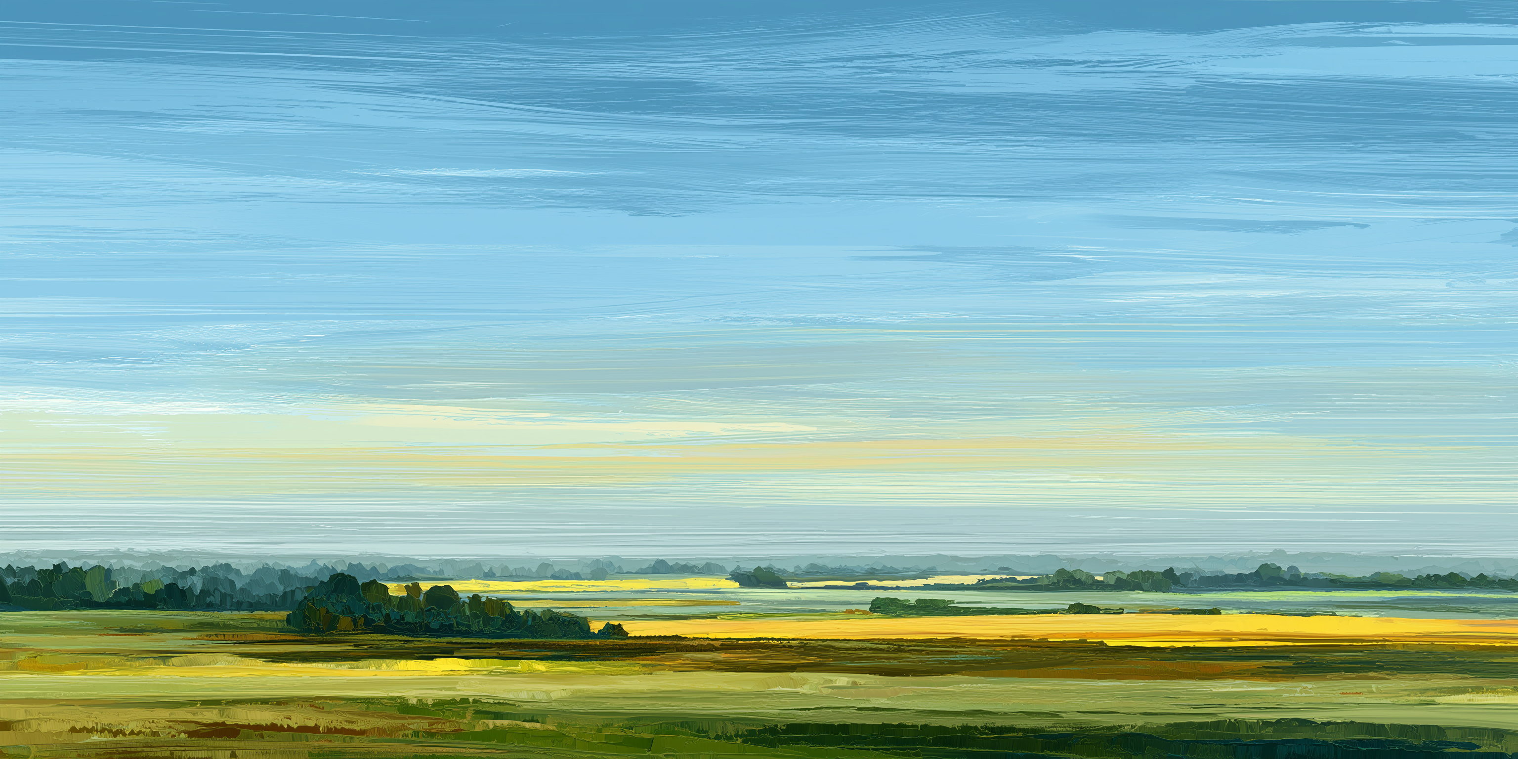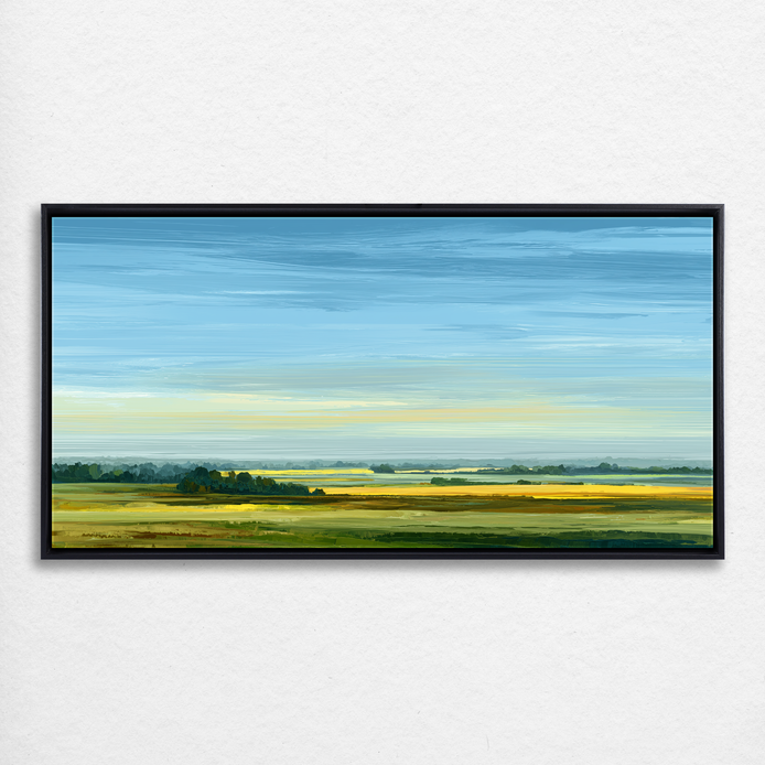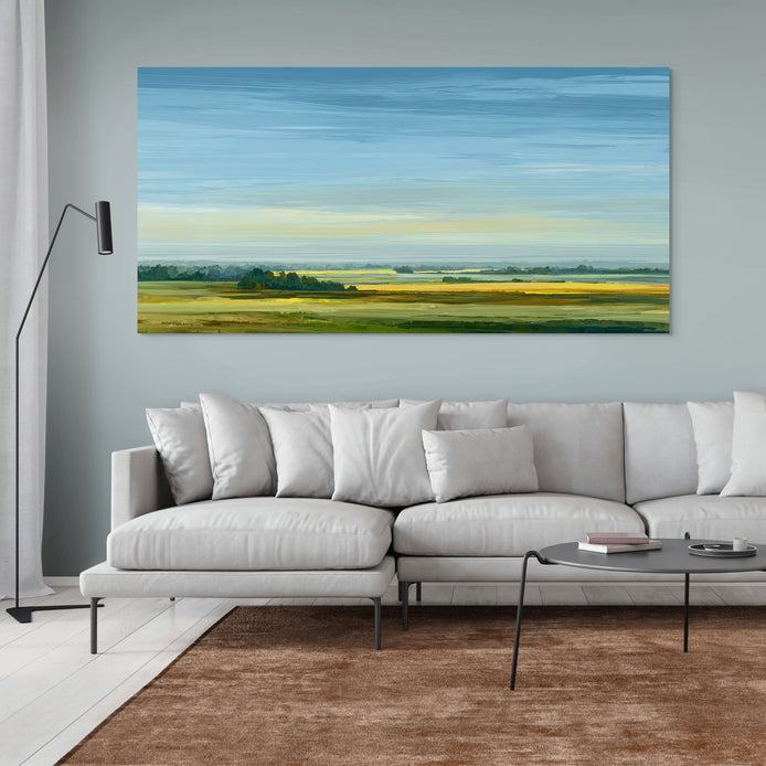 A serene countryside landscape evokes a tranquil mood as lush fields meet an expansive, soft blue sky. The composition utilizes rich colors and smooth transitions, capturing the quiet beauty of nature in a classic aesthetic. It is an ideal decorative piece for living rooms, bedrooms, or offices seeking a calming presence.