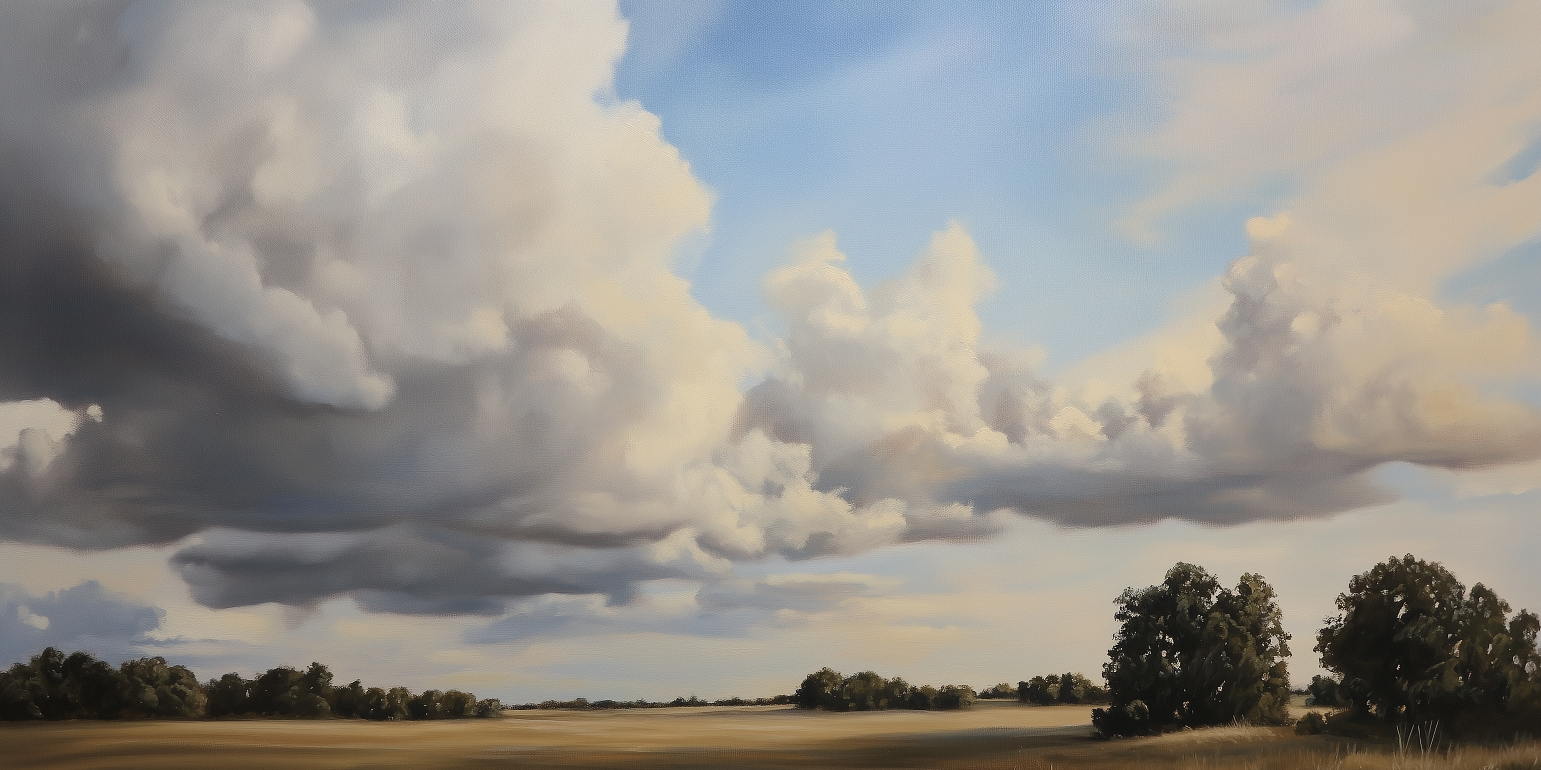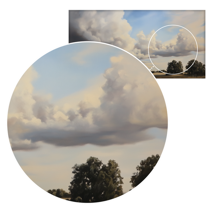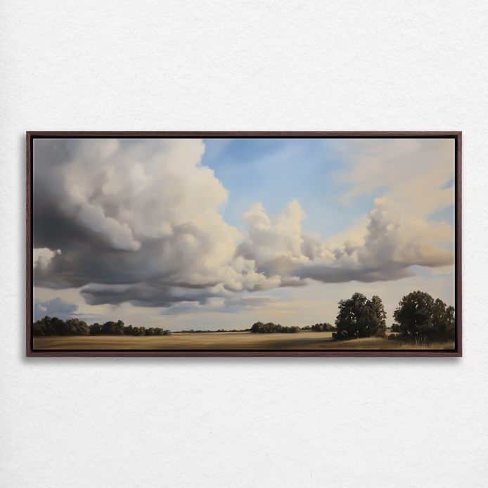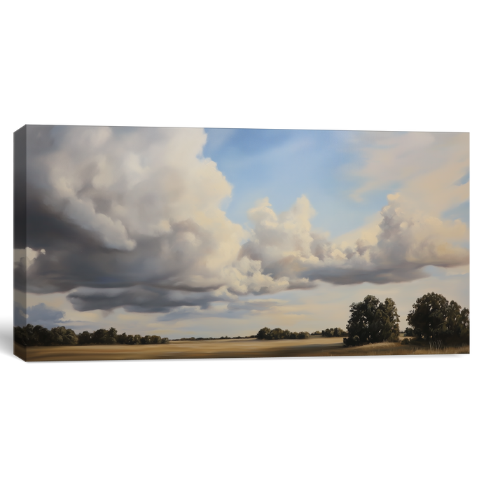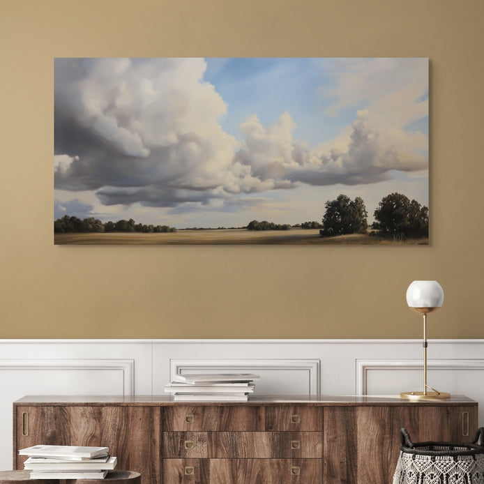 A sweeping hand-painted landscape capturing the drama of billowing clouds over golden fields, this piece evokes serenity and awe in equal measure. A perfect choice to bring warmth and openness to any space.